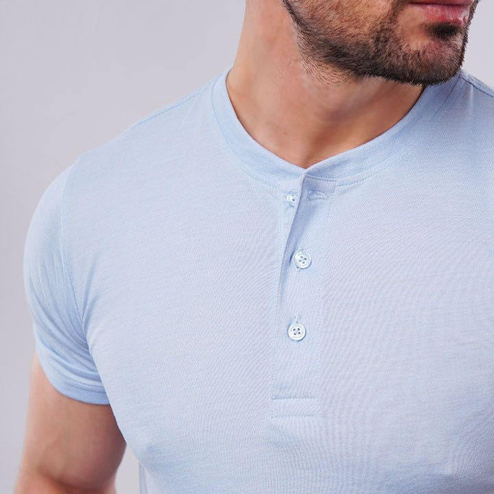เสื้อยืดเฮนลีย์ทรงสลิมฟิตสำหรับผู้ชาย คุณภาพสูง ผลิตตามสั่ง ผ้าฝ้าย/โพลีเอสเตอร์ 100% ป้องกันการเป็นขุย ด้านหน้าถักแบบกระดุม