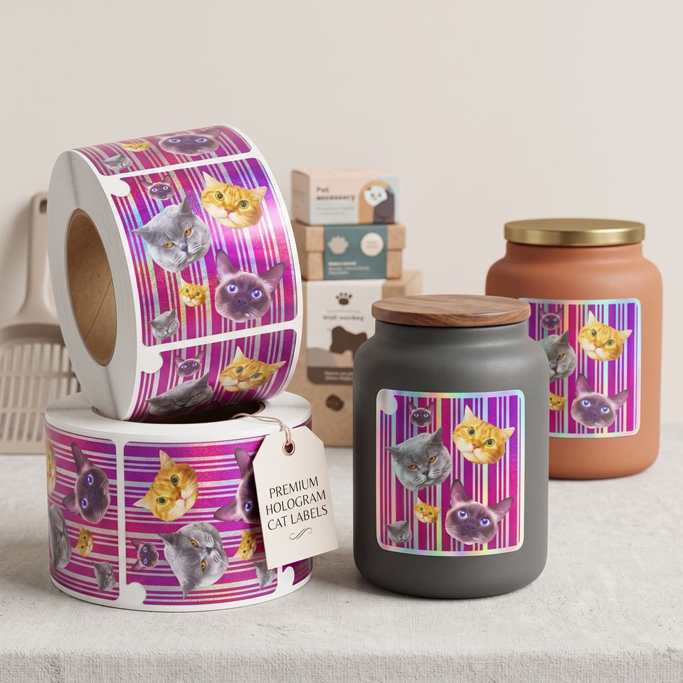 สติกเกอร์ไวนิลกันน้ำโฮโลโก้แมวพิมพ์ลายออกแบบได้ตามต้องการสติกเกอร์โลโก้น่ารักสำหรับตกแต่ง