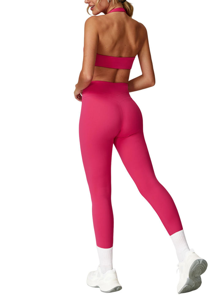 ชุดออกกำลังกายพิมพ์ลายโลโก้คุณภาพสูง ชุดบราและเลกกิ้งผ้าสแปนเด็กซ์ เอวยางยืด ปิดด้านหน้า ลายเรียบ