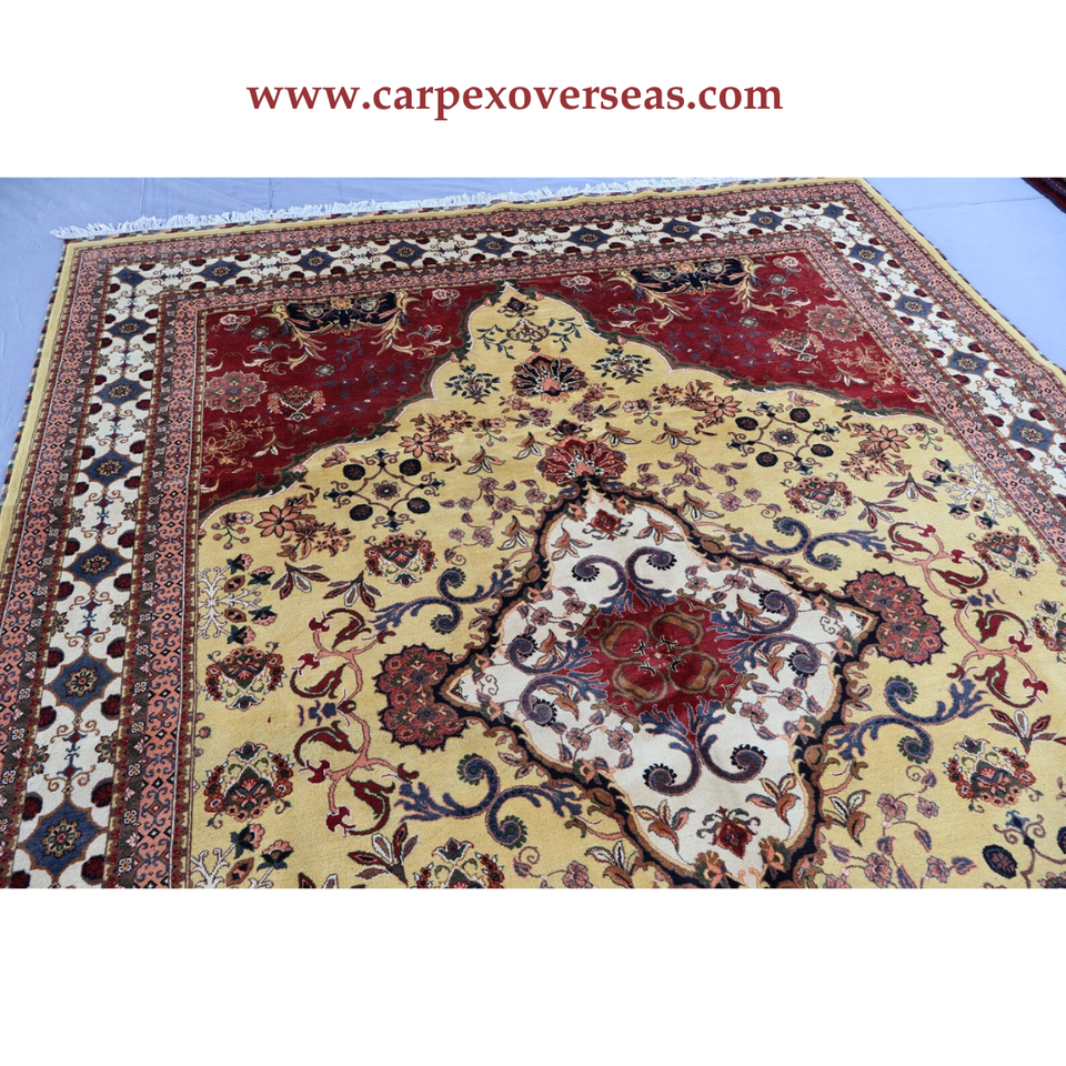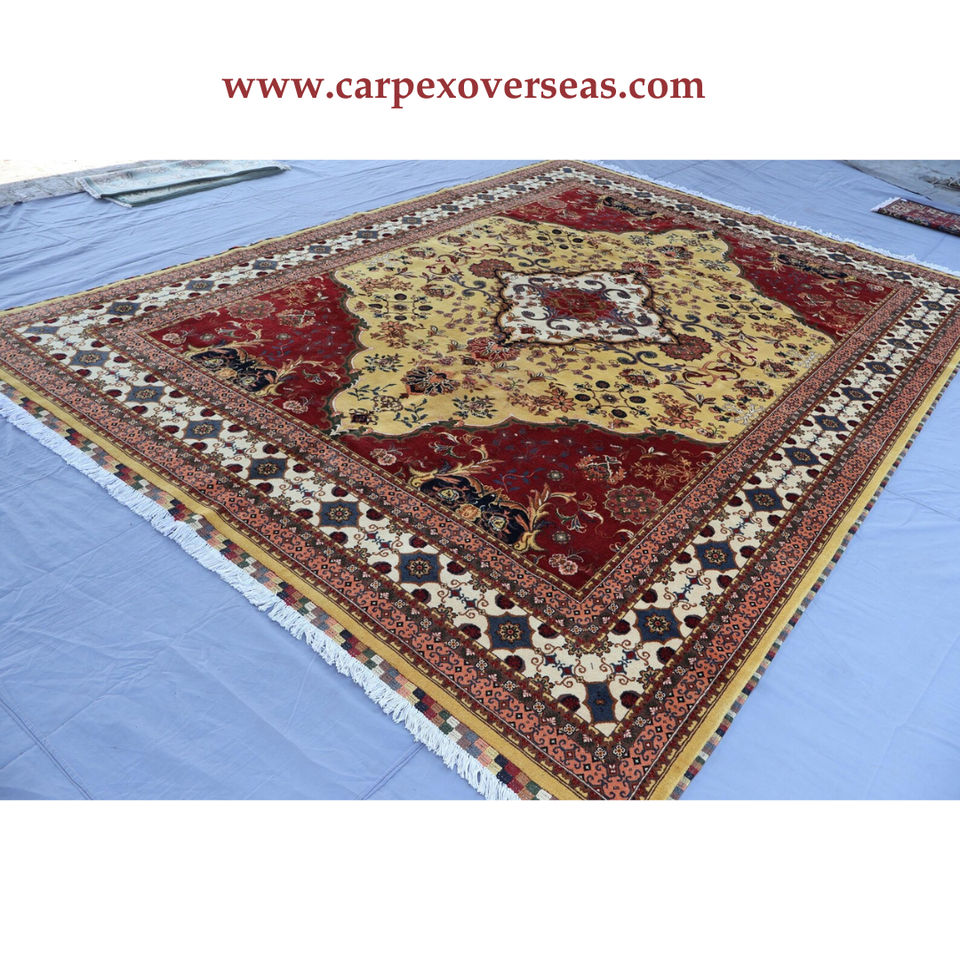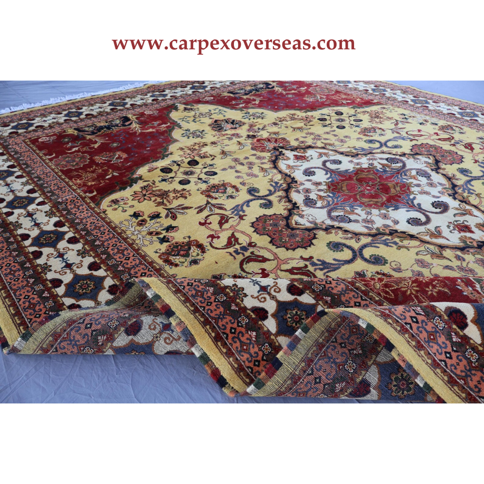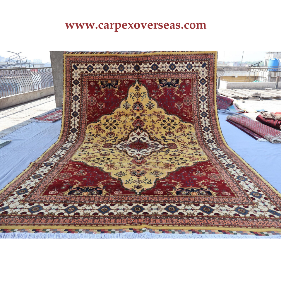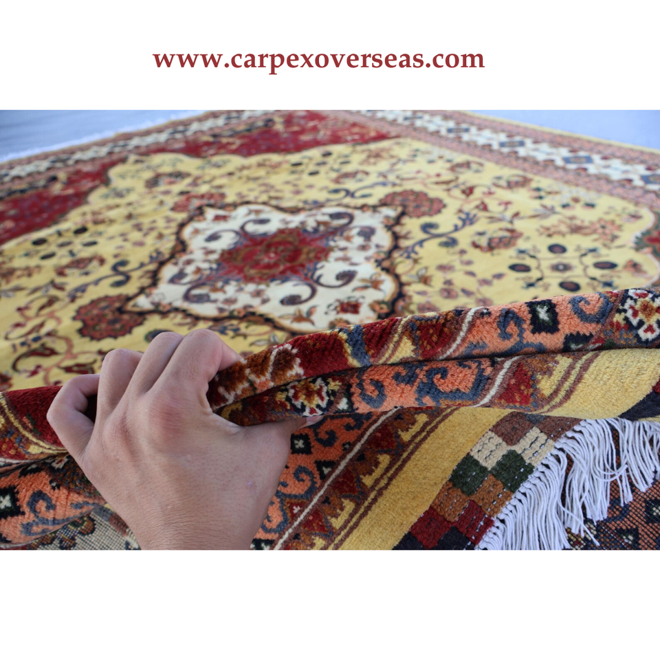 พรมขนสัตว์ตุรกีทำมือดีไซน์ดอกไม้สีเหลืองสีเบจสีแดงเครื่องซักและกันกระแทก