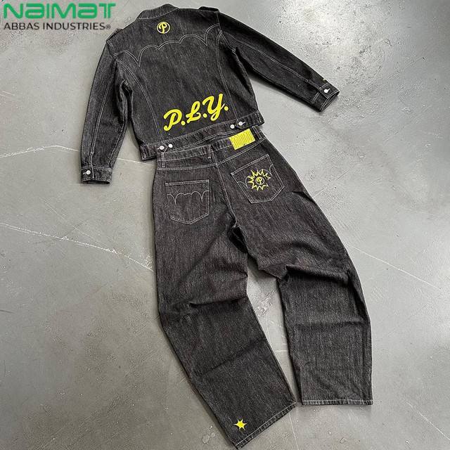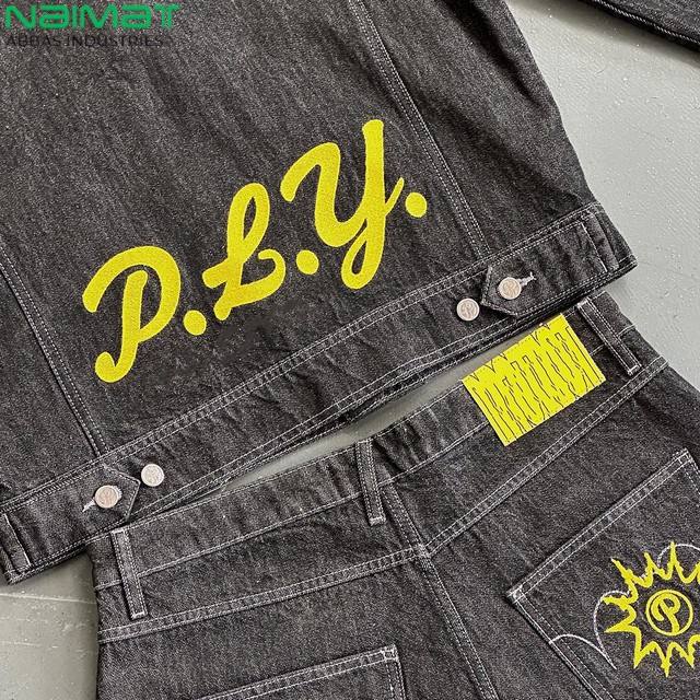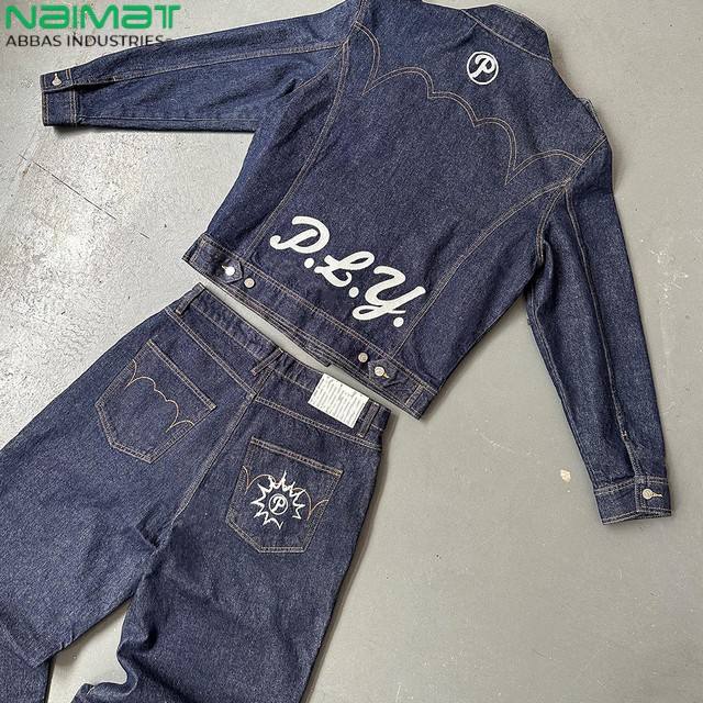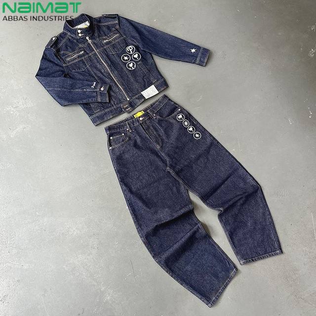 ชุดเสื้อผ้าสตรีทแวร์ฤดูหนาวคุณภาพสูง งานปัก แจ็คเก็ตยีนส์ฟอก กางเกงยีนส์ ชุดแทรคสูท ซับในผ้าฟลีซ