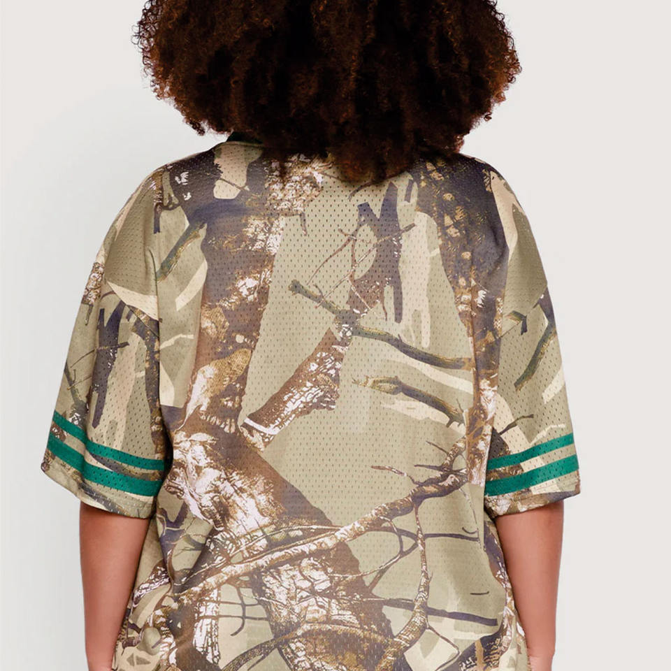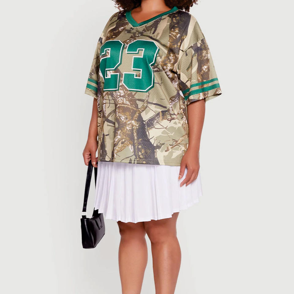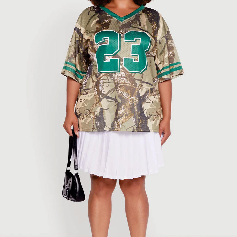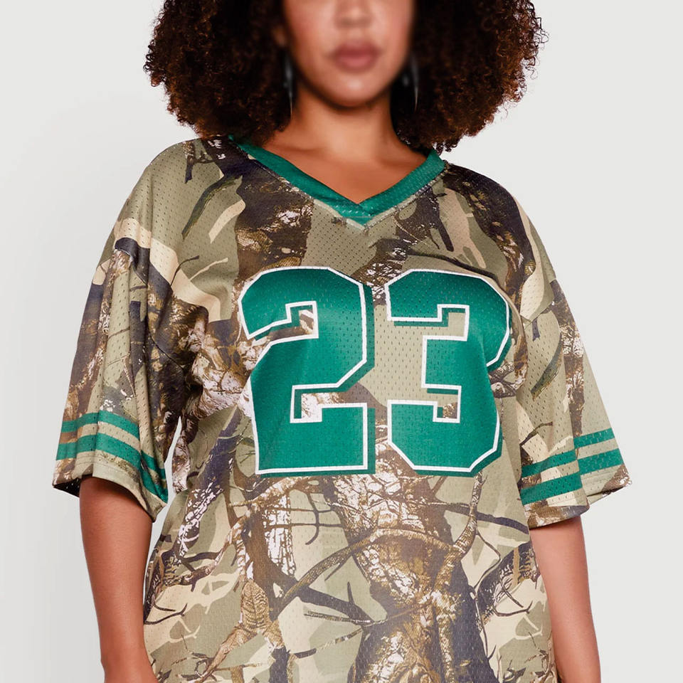 เสื้อฟุตบอลอเมริกันลายพรางคุณภาพสูงสำหรับผู้หญิง ทรงโอเวอร์ไซส์ ระบายอากาศได้ดี ผลิตตามสั่ง รับผลิตจำนวนมาก