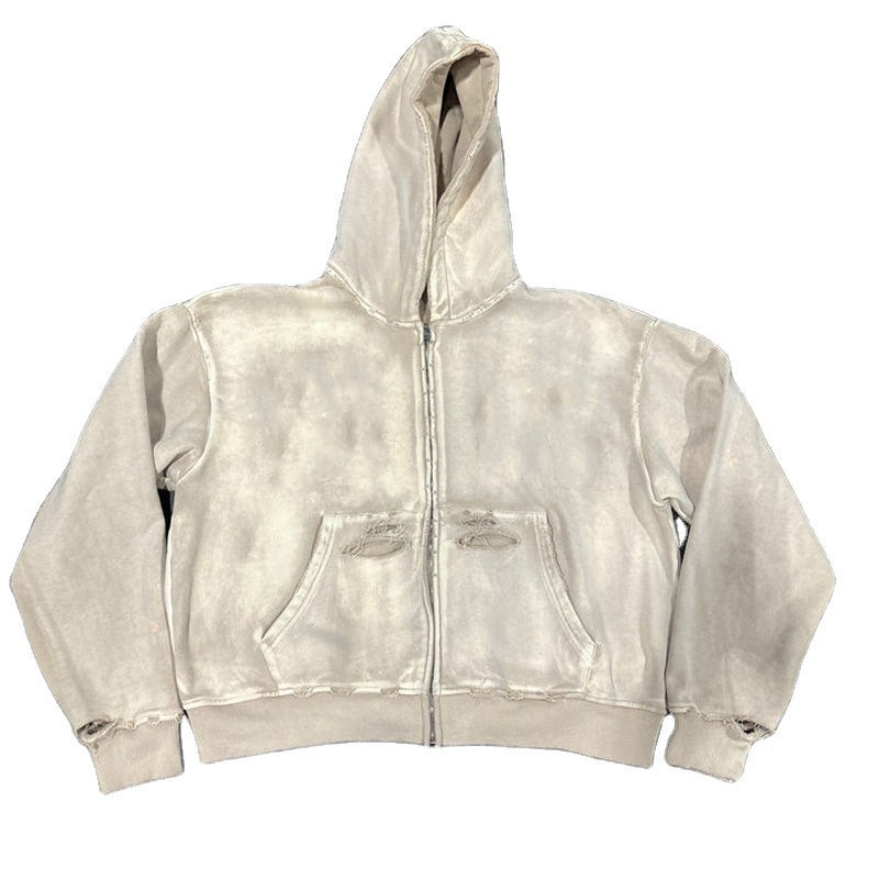 เสื้อฮู้ดซิปคุณภาพสูง สตรีทแวร์ ผ้าหนา ทรงครอป สำหรับผู้ชาย สไตล์ดิสเทรส ล้างสีแบบแอซิดวอช สีซีดจางจากแสงแดด ผ้าฝ้าย 100%