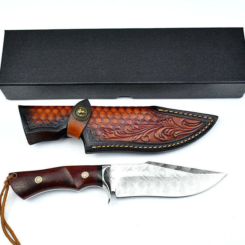 มีดแบบมีใบมีดคงที่ทำจากเหล็กดามัสกัสด้ามจับไม้โรสวูดสำหรับตั้งแคมป์กลางแจ้ง