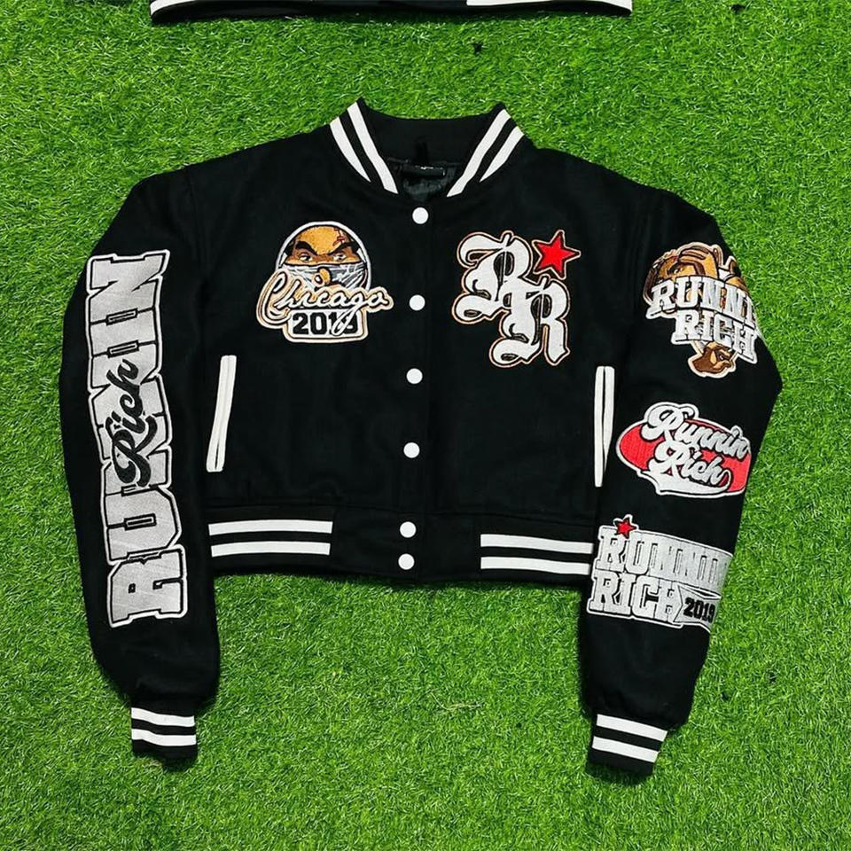 แจ็คเก็ตหนังวาร์ซิตี้แบบกำหนดเองคุณภาพสูง ยูนิเซ็กซ์ สไตล์สตรีทแวร์สำหรับฤดูใบไม้ร่วง โลโก้ด้านหน้า ดีไซน์ใหม่ ODM ฮิปฮอป