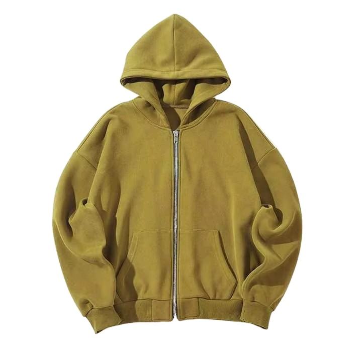 เสื้อฮู้ดดี้ผู้ชายทรงบ็อกซี่โอเวอร์ไซส์แบบซิป คุณภาพสูง สไตล์สตรีทแวร์ แบบเรียบๆ สีพื้น ล้างสีแบบแอซิดวอช พร้อมซิปและไหล่ตก