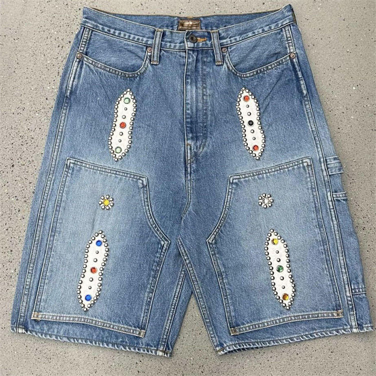 กางเกงยีนส์ขาสั้นสำหรับผู้ชายกางเกงขาสั้นผ้ายีนส์พลอยเทียมสำหรับผู้ชายออกแบบโลโก้ได้ตามต้องการ