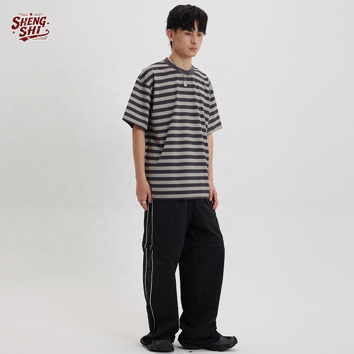 เสื้อยืดคอกลมลายทางสำหรับทีมวินเทจเสื้อยืดลายโลโก้250GSM ผ้าฝ้ายลายทางกว้าง100% OEM
