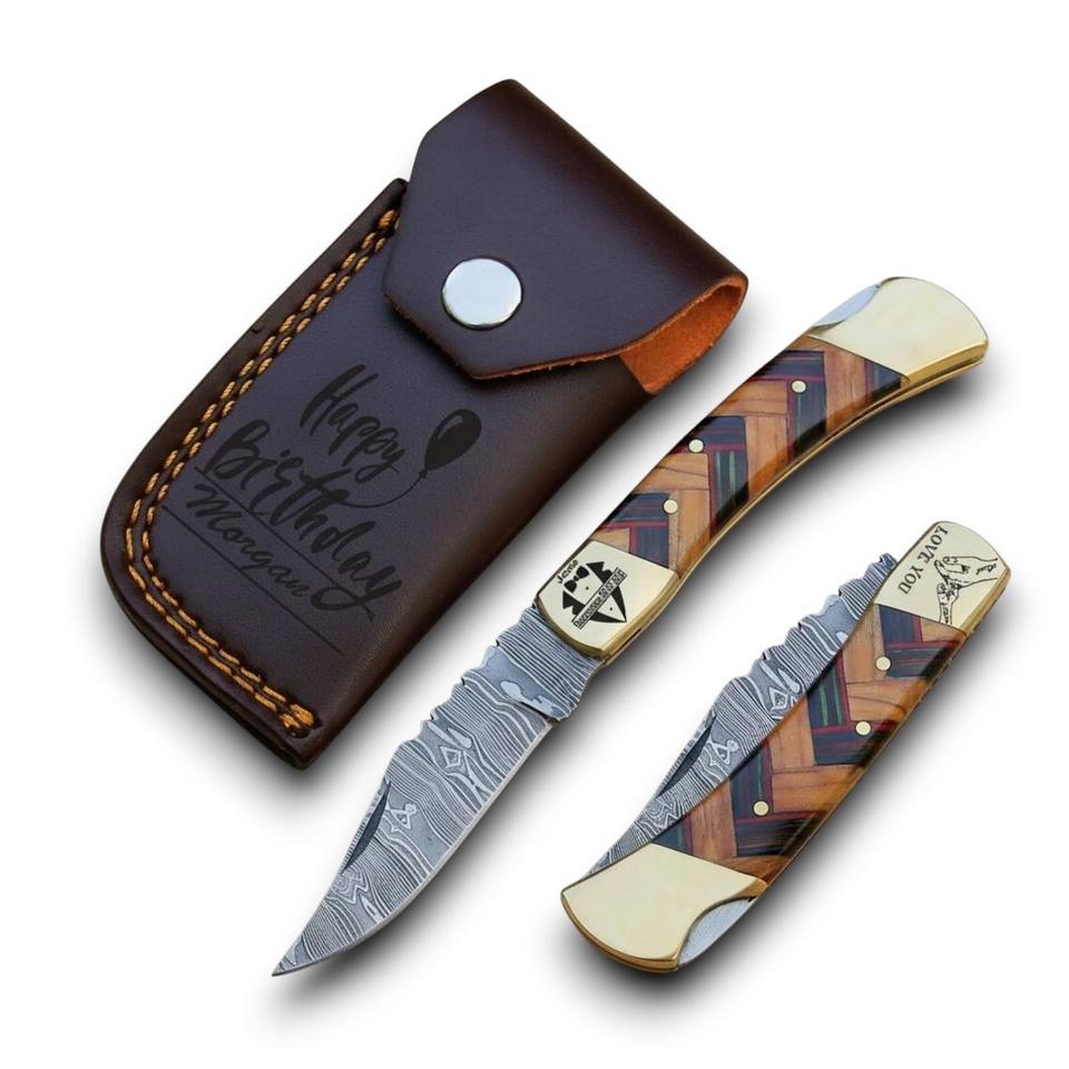 มีดพับ EDC คุณภาพสูง ทำจากเหล็กดามัสกัส ด้ามไม้หลากสี หุ้มทองเหลือง ปรับแต่งได้ พร้อมซองหนัง ขายส่งแบบ OEM