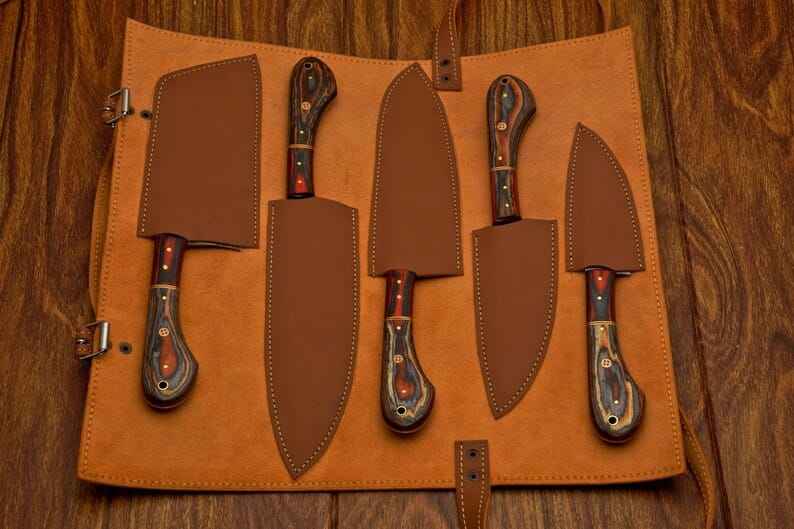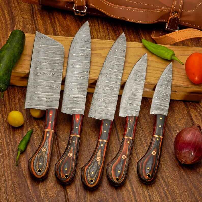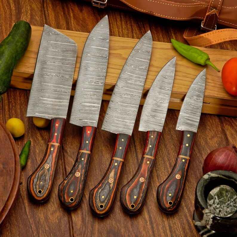 ชุดมีดเชฟเหล็กดามัสกัสคุณภาพสูง 5 ชิ้น ด้ามไม้ทำมือ ขายดี ใช้ในครัว ผลิตจากโรงงานโดยตรง พร้อมปลอกมีด