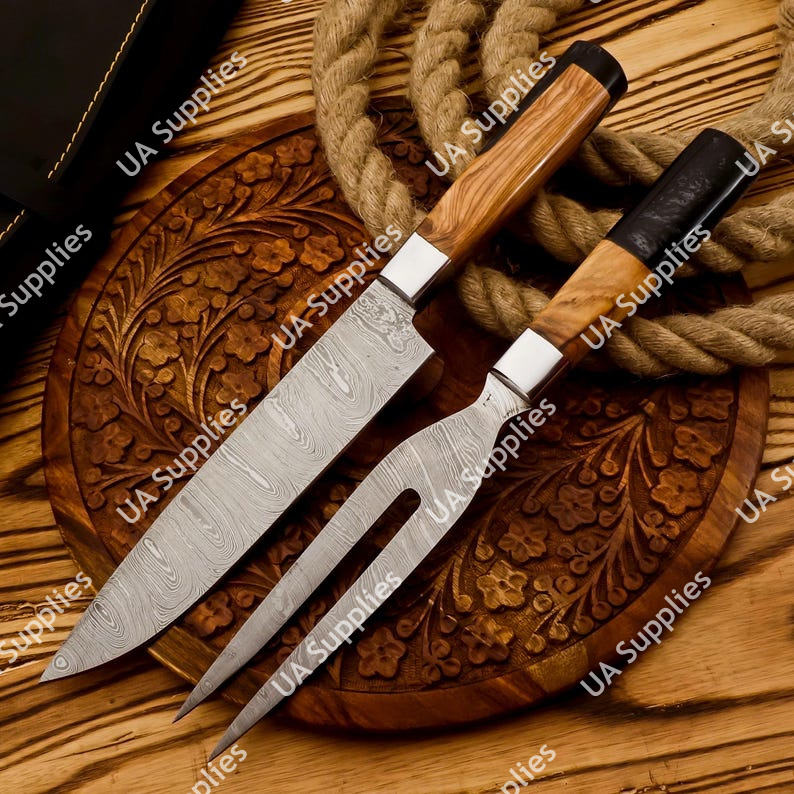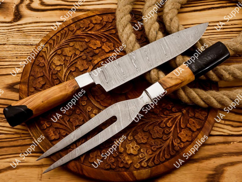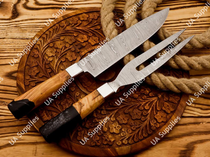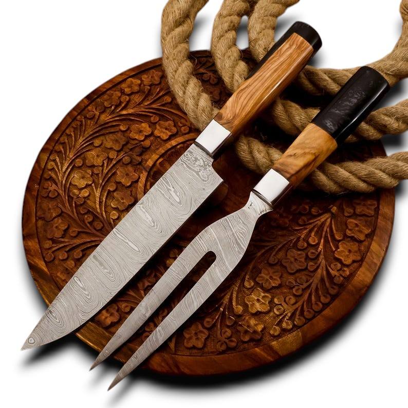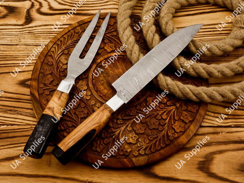 ชุดมีดทำครัว 2 ชิ้น เหล็กดามัสกัส ประกอบด้วยมีดสไลซ์และส้อม