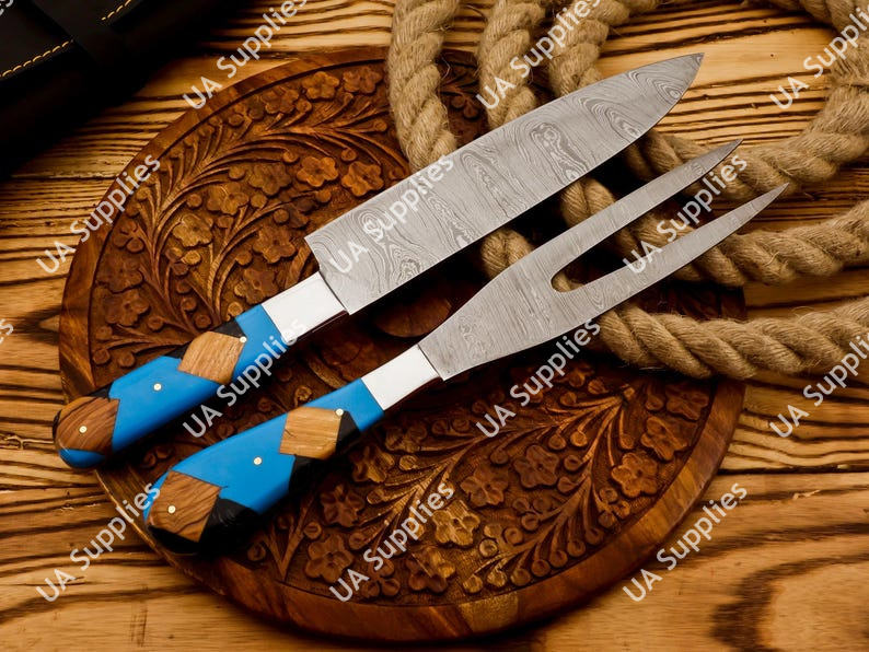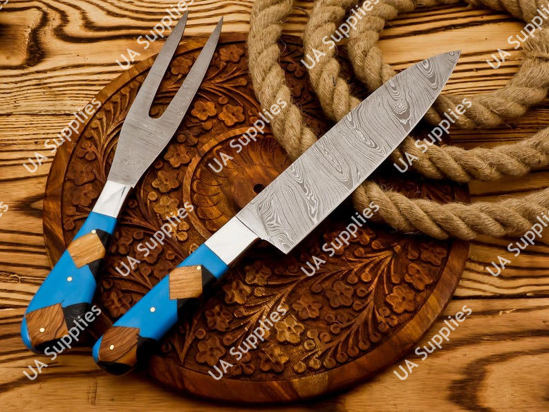 ชุดมีดทำครัว 2 ชิ้น เหล็กดามัสกัส ประกอบด้วยมีดสไลซ์และส้อม