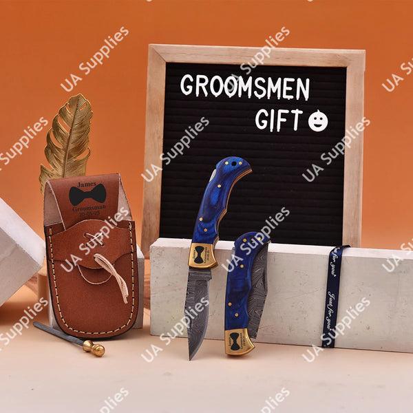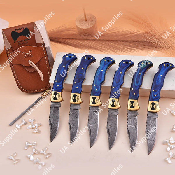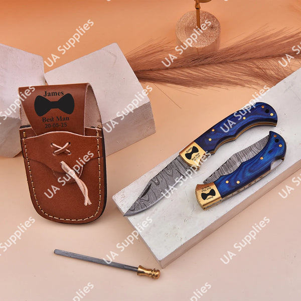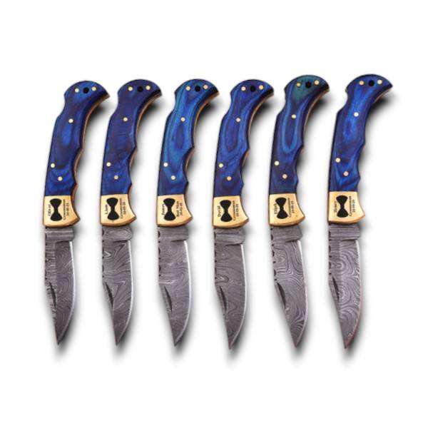 มีดพับเหล็กดามัสกัสคุณภาพสูง ด้ามไม้ปักก้าสีน้ำเงินฝังลายทองเหลือง พร้อมปลอกมีด EDC สำหรับพกพา