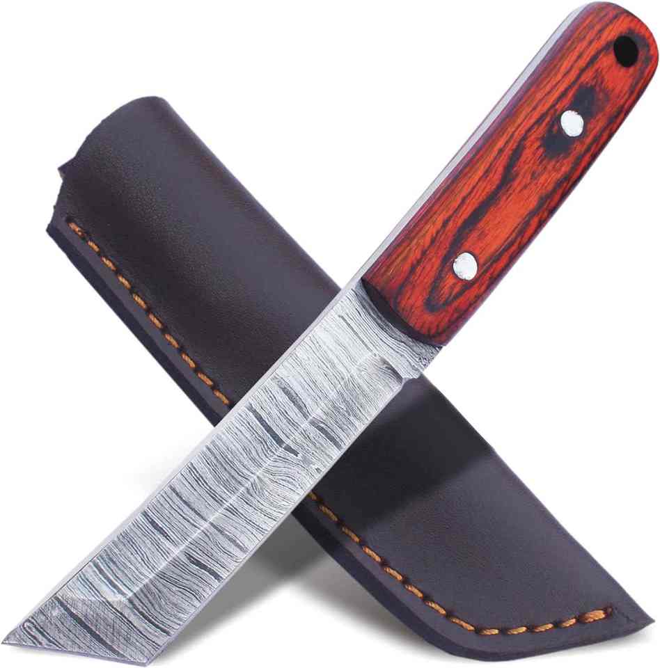Tanto มีดล่าสัตว์ทำจากเหล็กดามัสกัสพร้อมที่จับไม้สีมีดสวยงามพร้อมปลอกหนัง