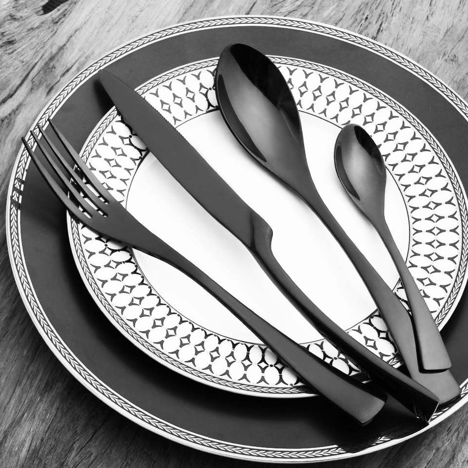 ชุดช้อนส้อมสแตนเลสสตีล 18/0 คุณภาพสูงแบบใช้แล้วทิ้ง 5 ชิ้น ดีไซน์หรูหราทันสมัย สีเงินเคลือบสีดำทอง