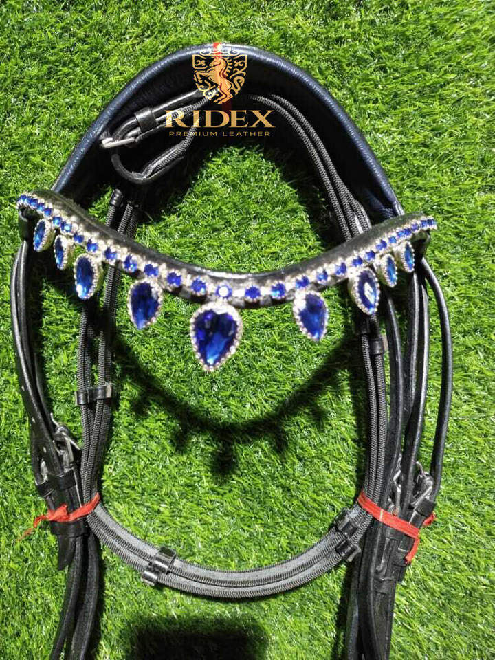 ชุดเดรสคุณภาพสูงบังเหียนม้าหนังนิ่มแผ่นรองสีน้ำเงินและสายคาดคิ้วคริสตัลพร้อมบรรจุภัณฑ์แบบกำหนดเอง