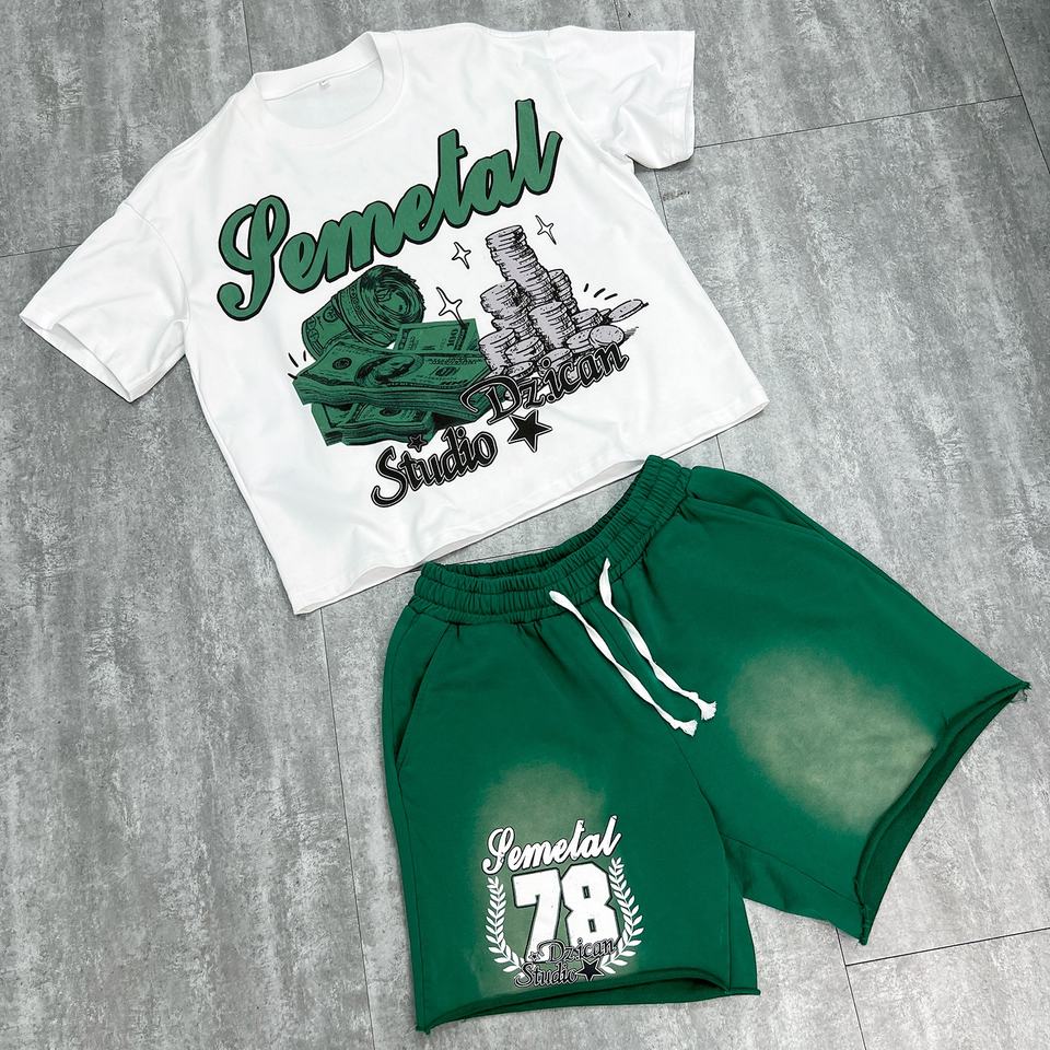 เสื้อยืดคุณภาพสูงทรงดรอปโชลเดอร์และกางเกงขาสั้นลายฟอกสี ชุดเซ็ต 2 ชิ้น เสื้อยืดผู้ชายลายกราฟิกทรงโอเวอร์ไซส์ผ้าฝ้ายสั่งทำพิเศษ