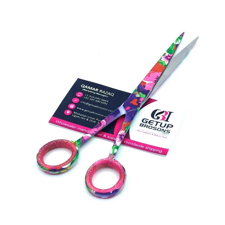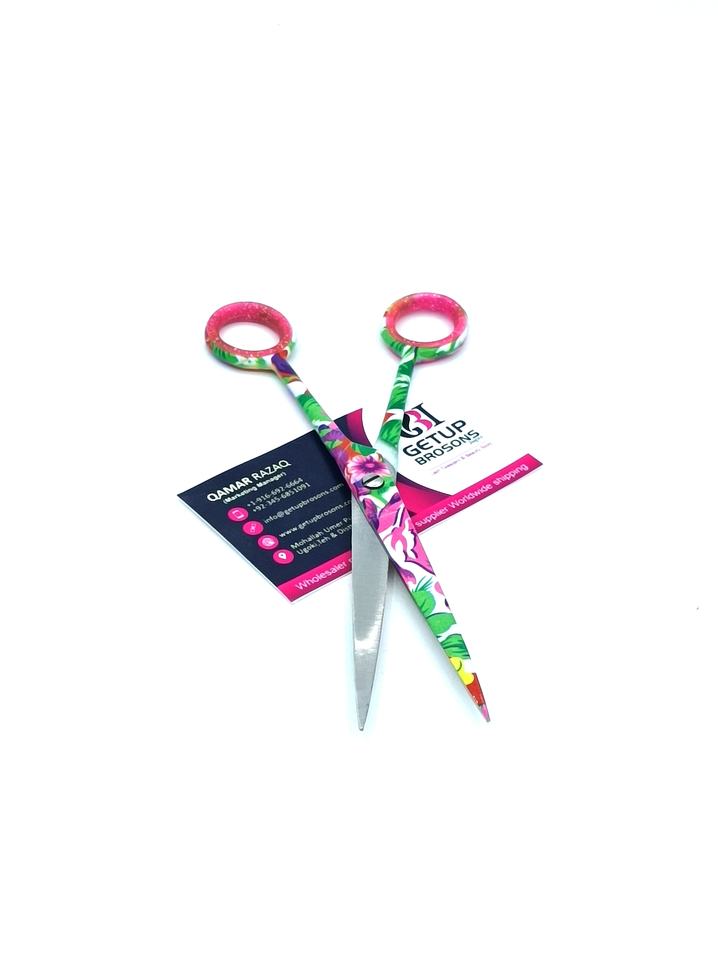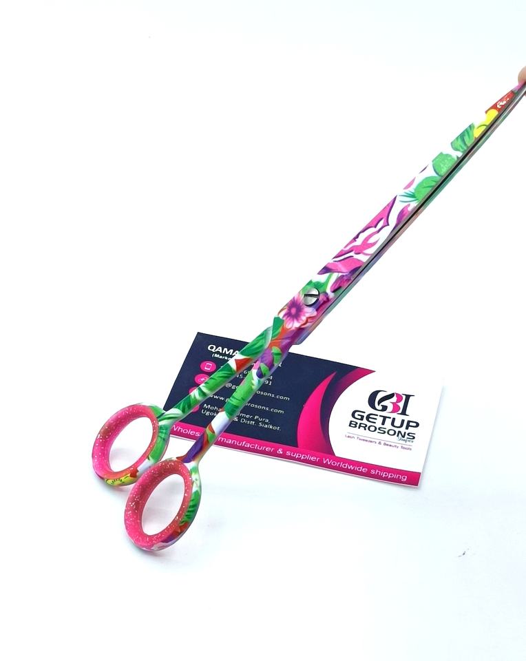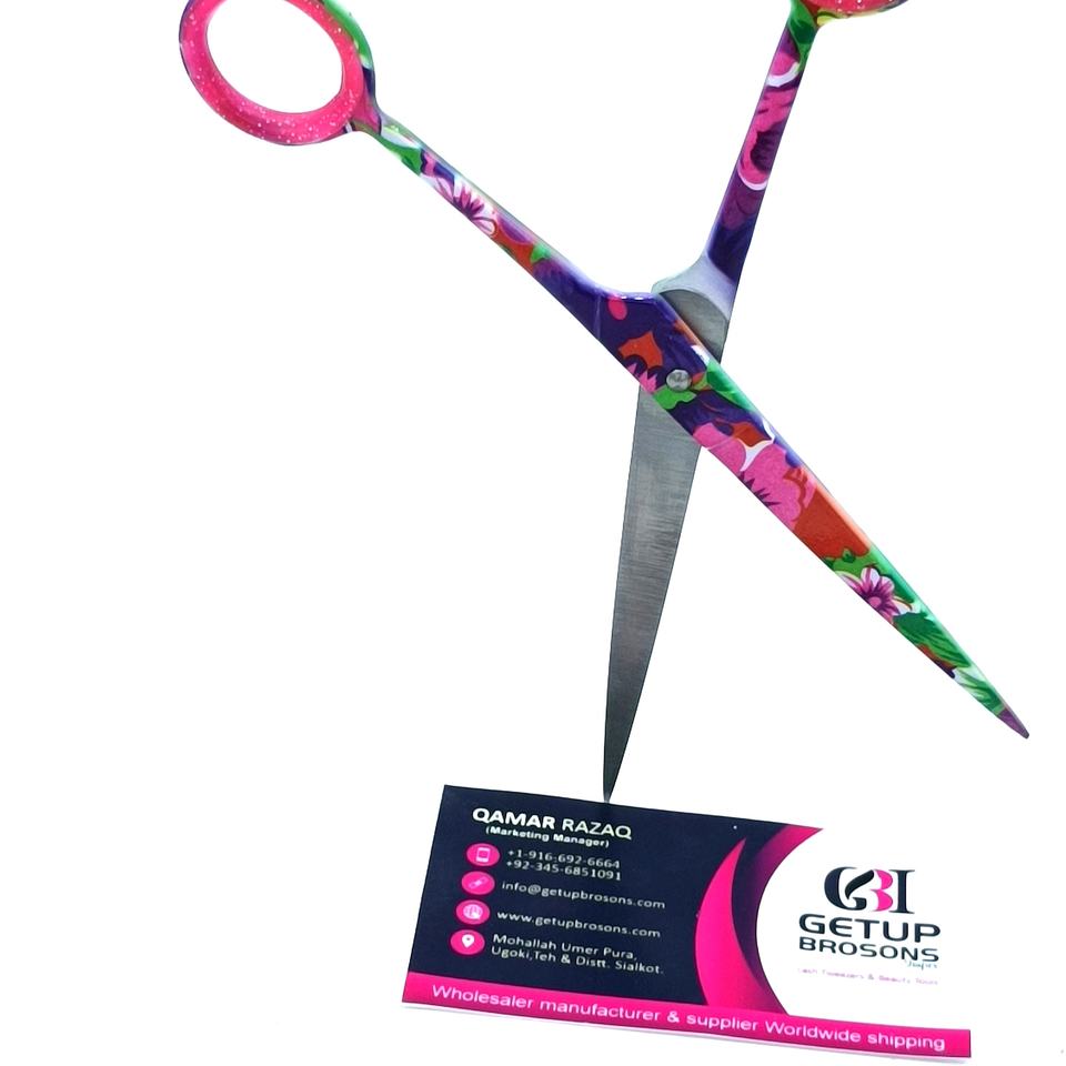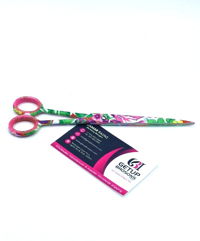 กรรไกรตัดผมสแตนเลสเคลือบกระดาษลายดอกไม้คุณภาพสูง ทนทาน ด้ามยาว ใบมีดคม ปลายแหลม รับทำโลโก้ตามสั่ง