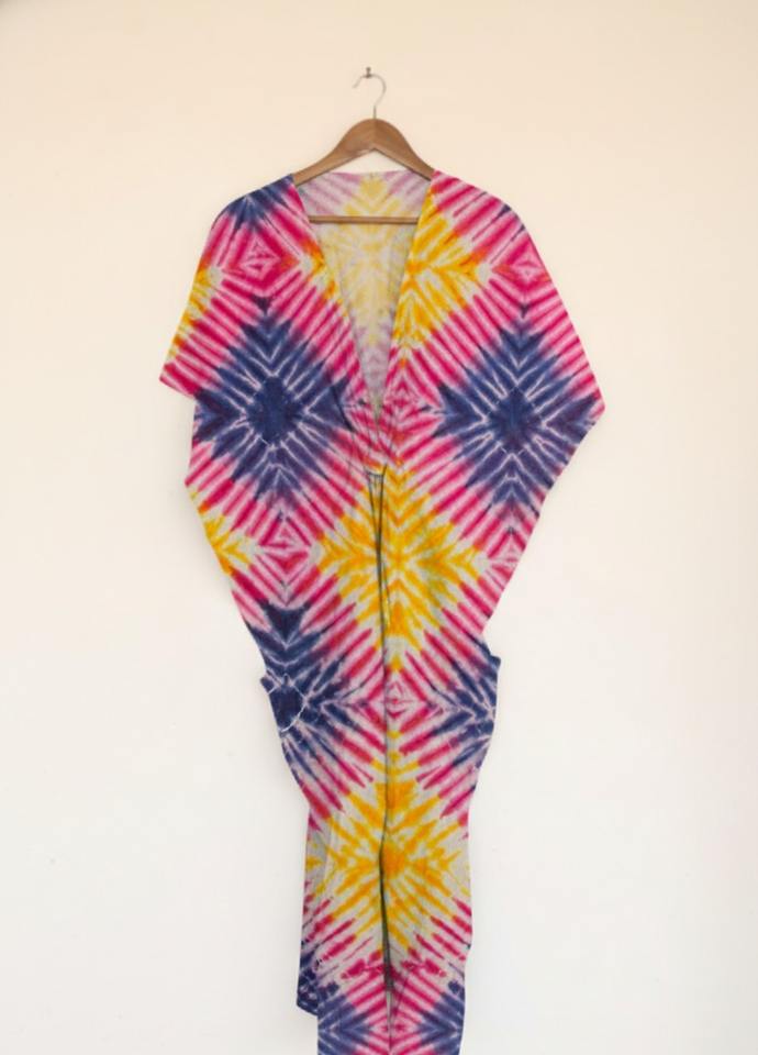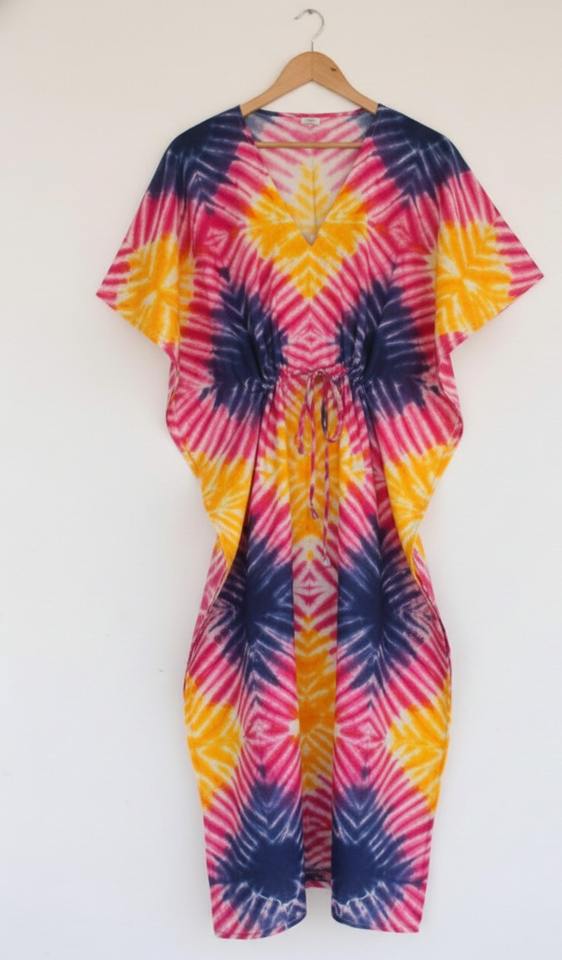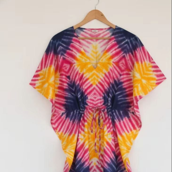 ผ้าคัฟตันโบฮีเมียนคุณภาพสูง เป็นมิตรกับสิ่งแวดล้อม ผ้าฝ้ายแท้ 100% ลายมัดย้อม แต่งลูกไม้ เอวยางยืด แขนทรงโดลแมน ซักได้ ความยาวแบบแม็กซี่