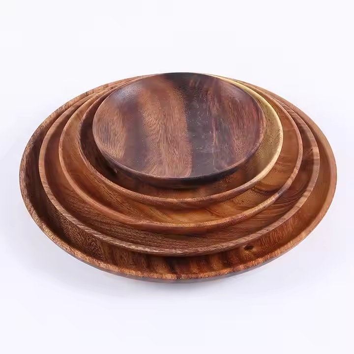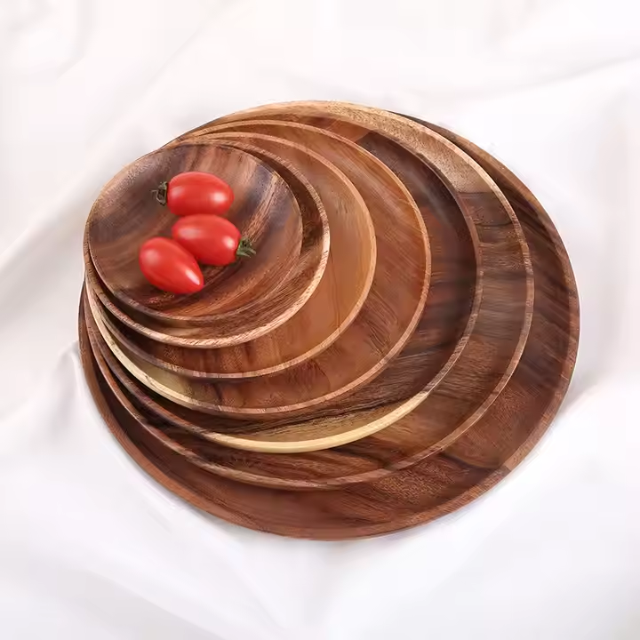 จานเสิร์ฟทรงกลมไม้กระถินณรงค์คุณภาพสูง เป็นมิตรกับสิ่งแวดล้อม สำหรับงานเลี้ยง ใช้ในครัว ผลิตโดย Crescent Crafts