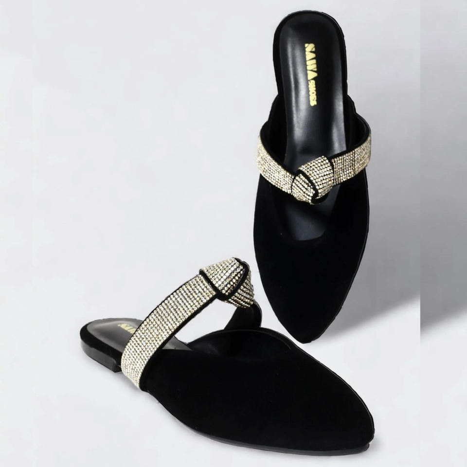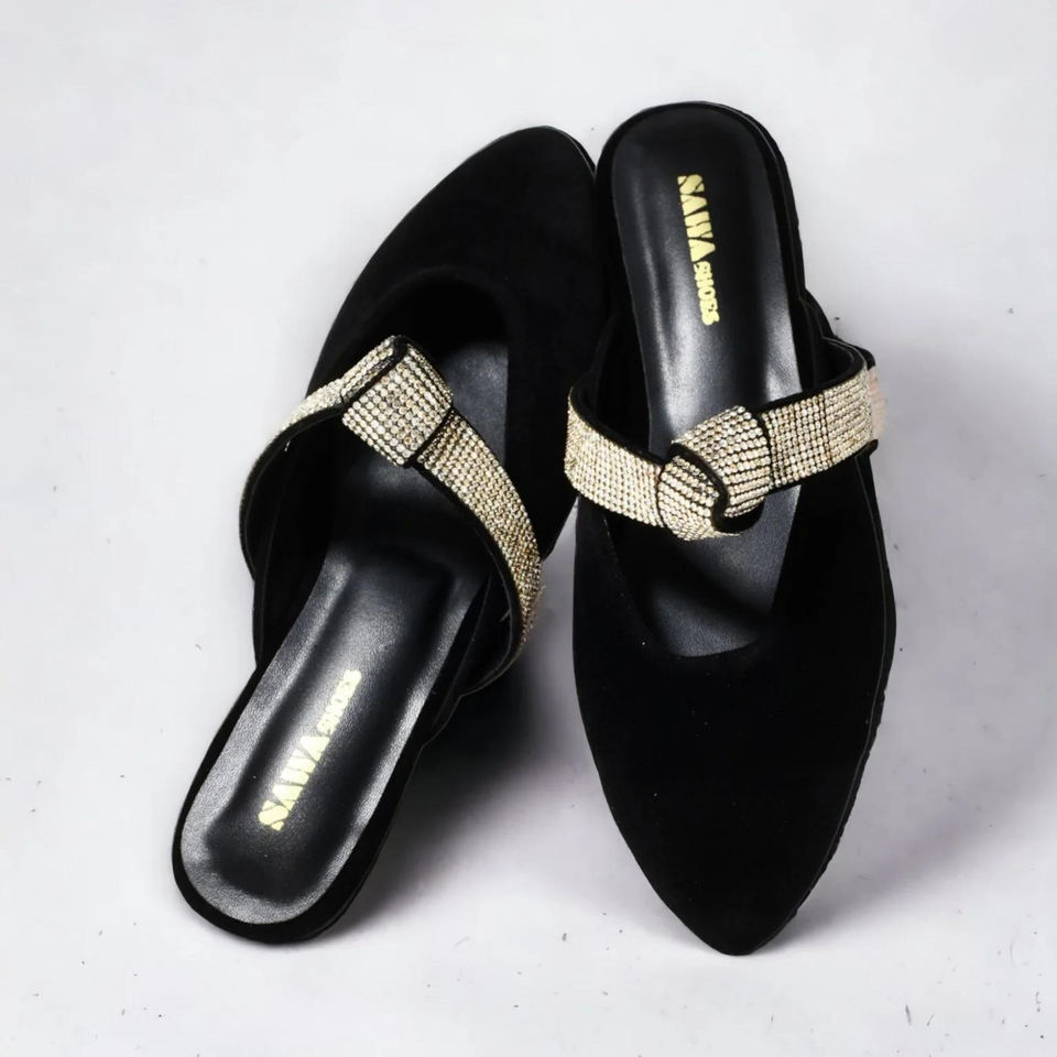 วัสดุ:Rexine หนังนิ่มสีดำด้านบนพร้อมตาข่ายพลอยเทียมพื้นรองเท้า TPR แบน