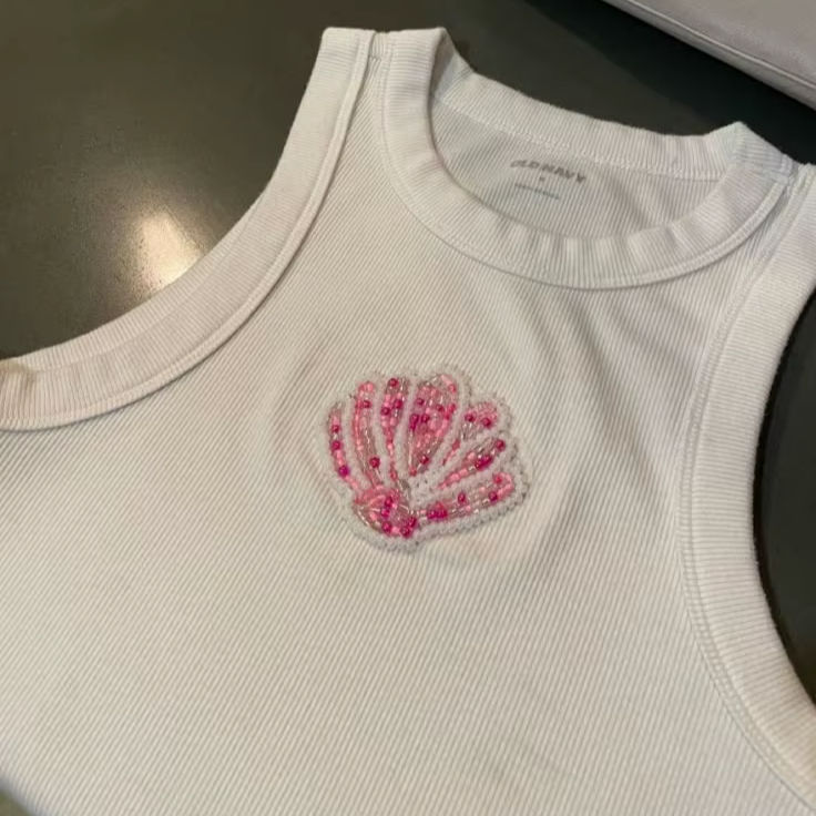 เสื้อกล้ามผู้หญิงผ้าฝ้ายริบสีขาวปักลายเปลือกหอยสีชมพูด้วยลูกปัดแก้วคุณภาพสูง เหมาะสำหรับใส่ไปเที่ยวทะเลในช่วงฤดูร้อน