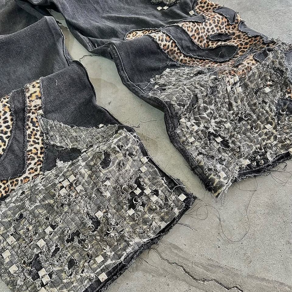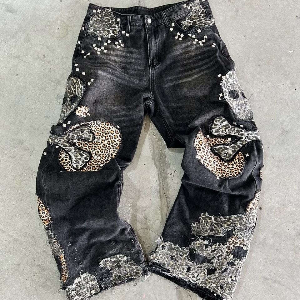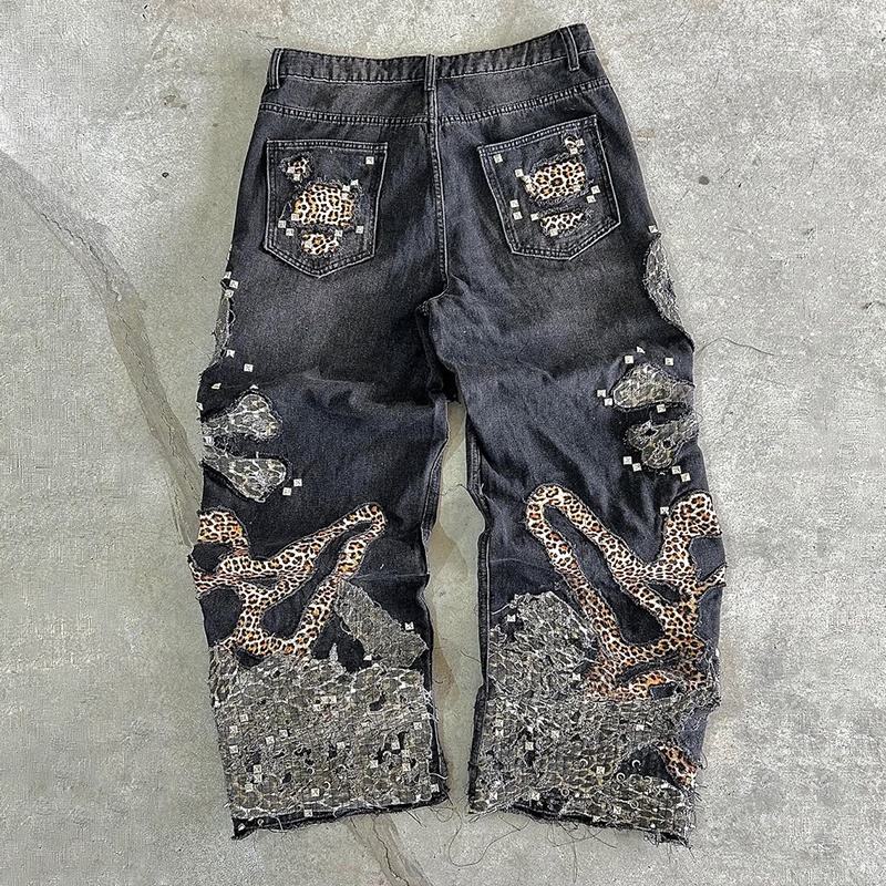 กางเกงยีนส์เดนิมผู้ชายทรงขาบานปักลายคุณภาพสูง ไซส์ใหญ่ สไตล์สตรีท แต่งขาด ปะติด ปะต่อ