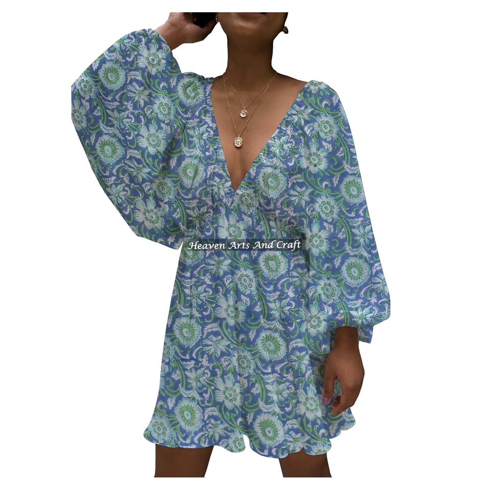เสื้อผ้าผู้หญิงคุณภาพสูงสไตล์ยุโรปและอเมริกา ชุดเดรสผ้าฝ้ายพิมพ์ลายบล็อกหลากสีแบบแฮนด์เมด คอวีลึก ทรงโคมไฟ