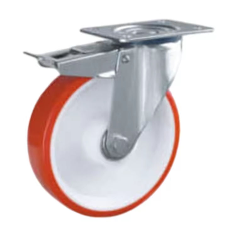 ล้ออุตสาหกรรมมาตรฐานยุโรปคุณภาพสูง PU + PP แกนกลาง ลูกปืนคู่ หมุนได้ พร้อมเบรก ราคาแข่งขัน