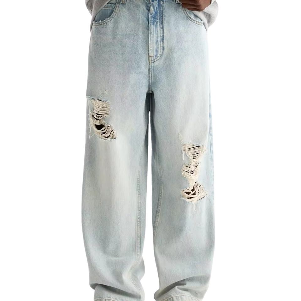 กางเกงยีนส์ทรงตรงขาดๆ แบบวินเทจ คุณภาพสูง สไตล์สตรีทแฟชั่น ลุคทำสีซีด ลุคขาดๆ สำหรับผู้ชาย ผลิตในปากีสถาน
