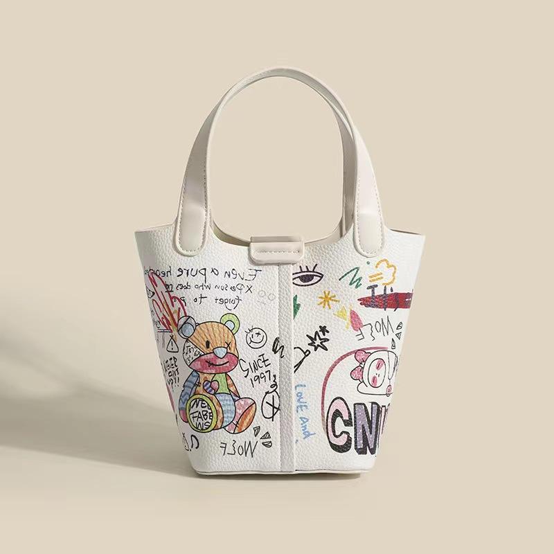 High Quality Fashion Luxury Handbags PU Leather Large Capacity Designer Cute Graffiti Bucket Bags Women 2024