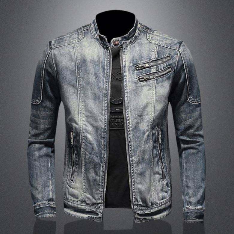 แจ็คเก็ตยีนส์มอเตอร์ไซค์ทรงเท่ห์ คุณภาพสูง แฟชั่นทันสมัย ซิปหน้า ปกเสื้อแบบลา펠 สไตล์วินเทจ สำหรับผู้ชาย