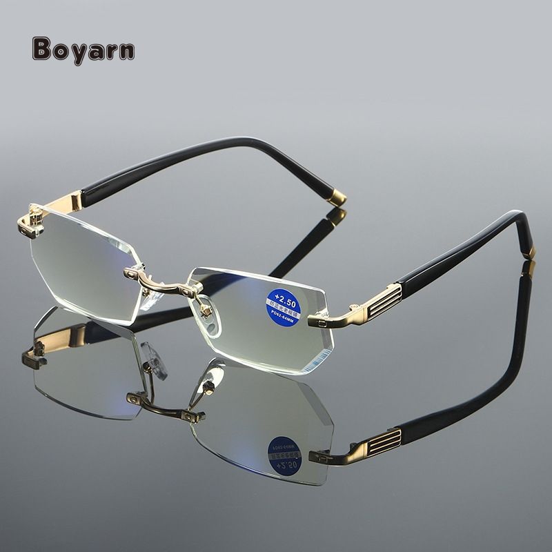 แว่นตาอ่านหนังสือกรอบโลหะไร้ขอบทรงสี่เหลี่ยม คุณภาพสูง แฟชั่นสำหรับทุกเพศ ป้องกันแสงสีฟ้า สำหรับผู้หญิงและผู้ชาย