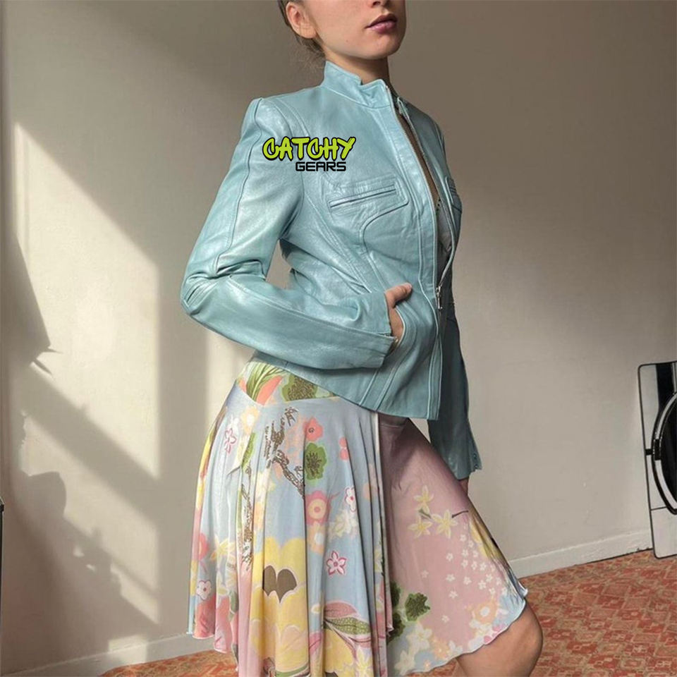 แจ็กเก็ตหนังแกะสำหรับผู้หญิงกันลมมีซิปตกแต่งด้วยแถบไข่มุกลายพราง