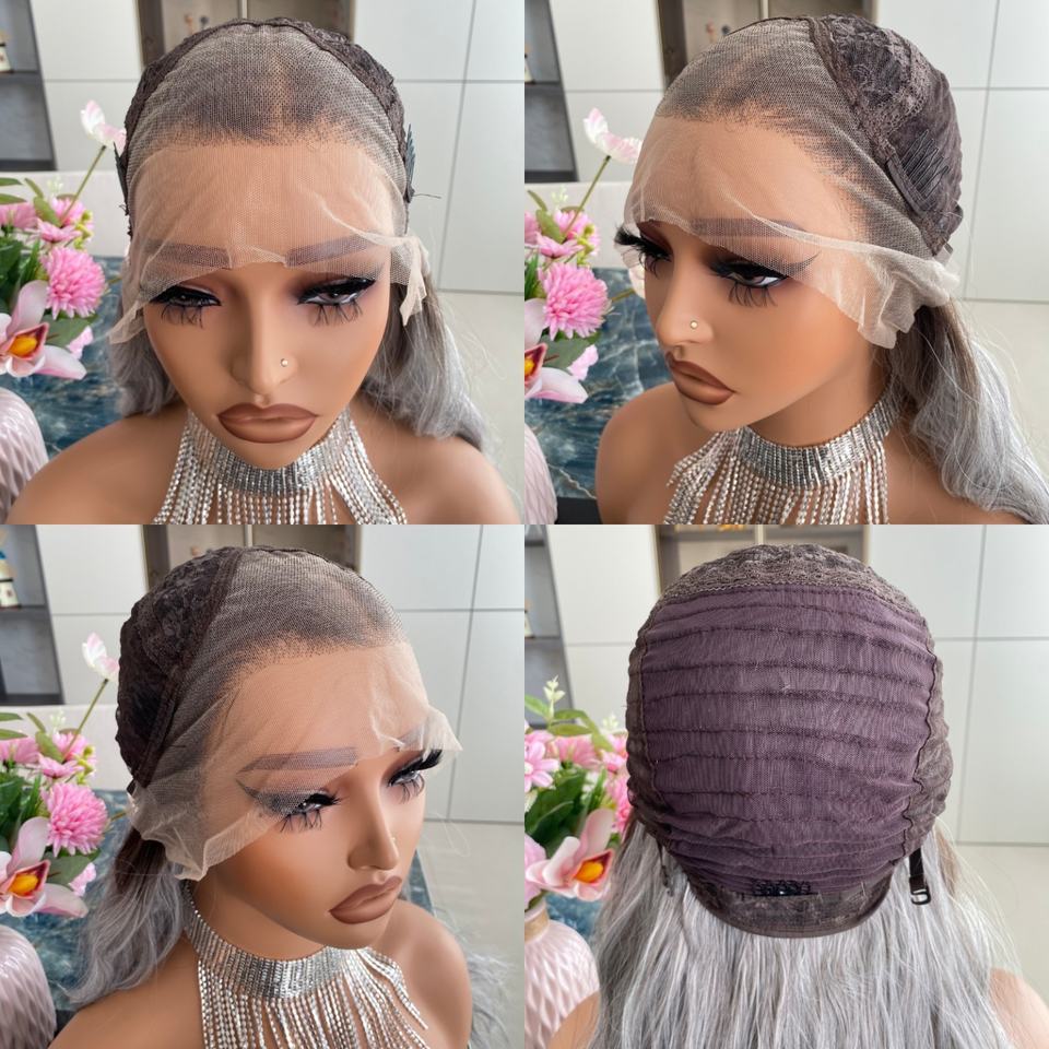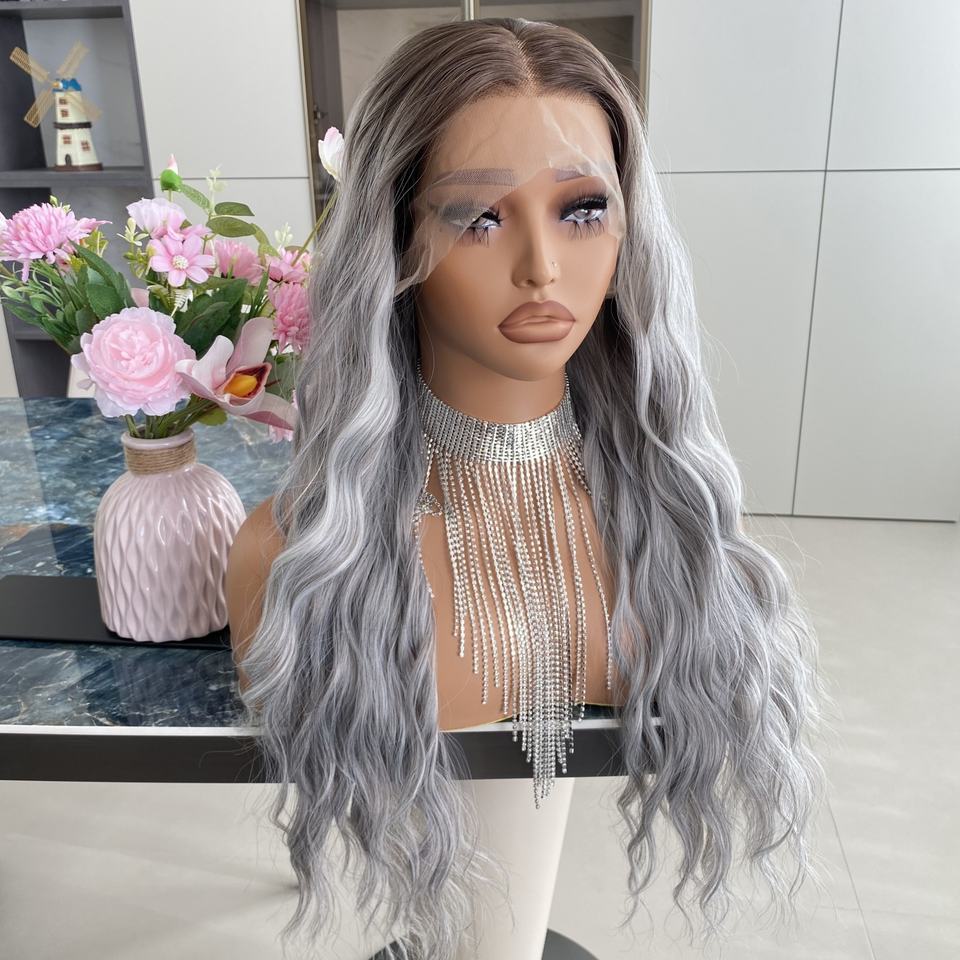 วิกผมไฟเบอร์คุณภาพสูง ทนความร้อน สีเทาออมเบร 13x4 hd swiss ฐานลูกไม้โปร่งใส วิกผมสังเคราะห์ ถอนขนมาแล้ว