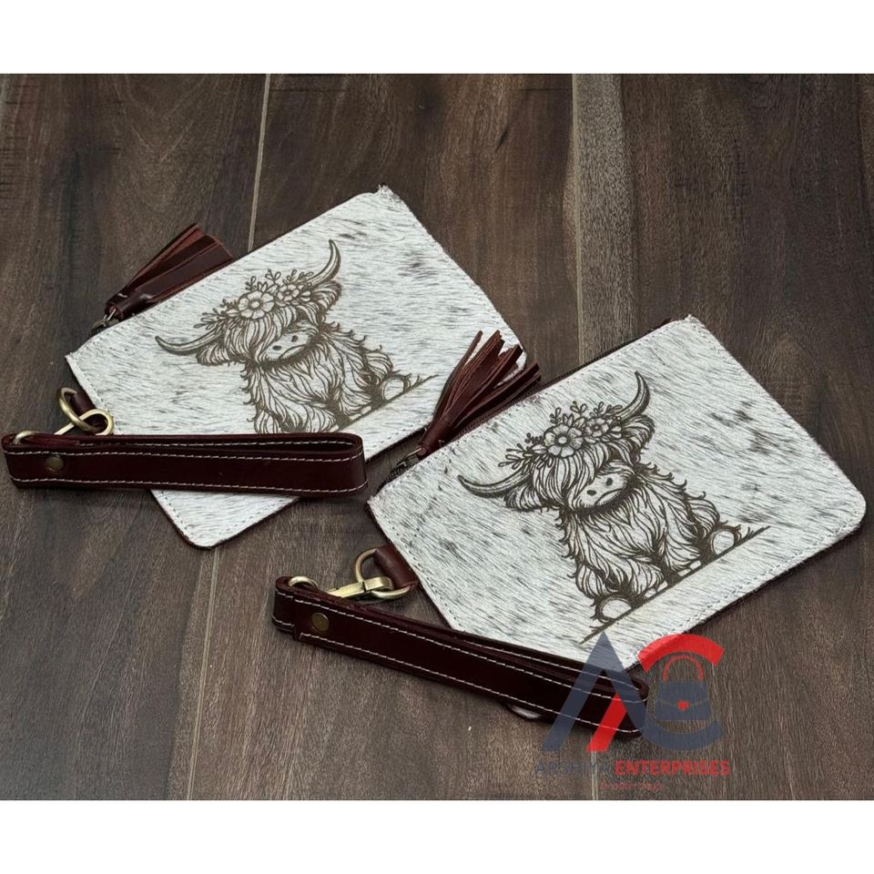 Cowhide Leather Floral Highland Cow Laser Engraved Clutch