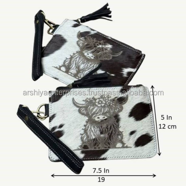 High Quality Floral Highland Cow Engraving Cowhide Leather Wristlet Clutch with Tassel Zipper Closure & Detachable Leather Strap