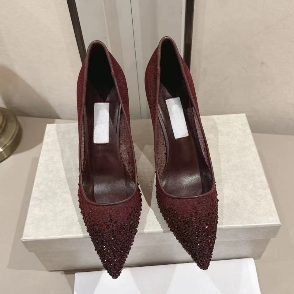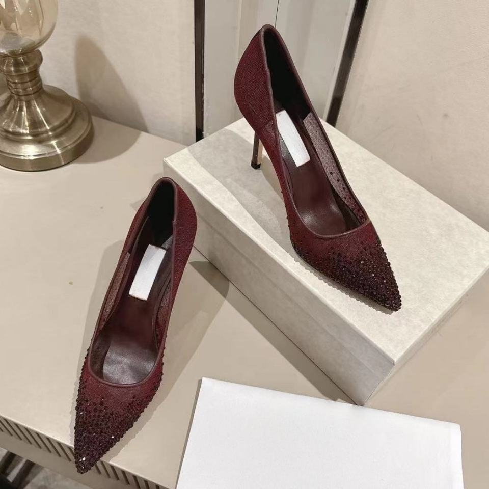 รองเท้าดีไซน์เนอร์คุณภาพสูงแบบสวม คลาสสิก ประดับคริสตัล หรูหรา ผ้าตาข่าย ระบายอากาศได้ดี หัวแหลม ส้นบาง