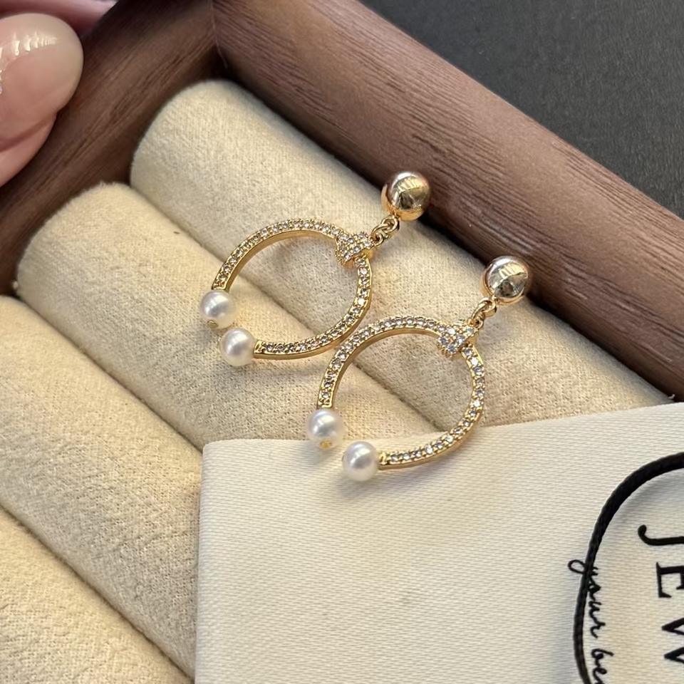 ต่างหูคริสตัลน้ำจืดคุณภาพสูง ใหม่ ขนาด 4-5 มม. รูปทรงกลม แสงสว่างดี มีตำหนิเล็กน้อย ดีไซน์รูปเกือกม้าแบบลูกปัดคู่