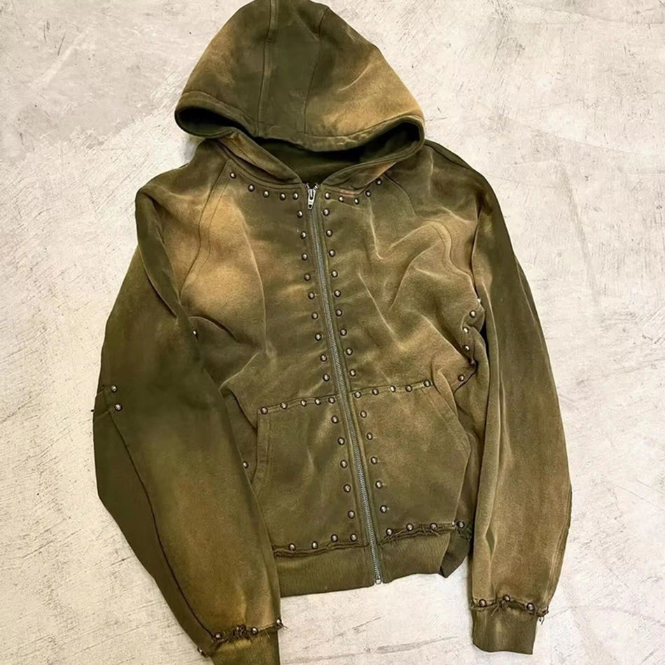 เสื้อฮู้ดซิปมีซิปประดับพลอยเทียมแบบเต็มโลโก้ตามสั่งเครื่องแต่งกายแนวสตรีทผ้าปะติด100% ผ้าฝ้ายสีซีดแสงแดด