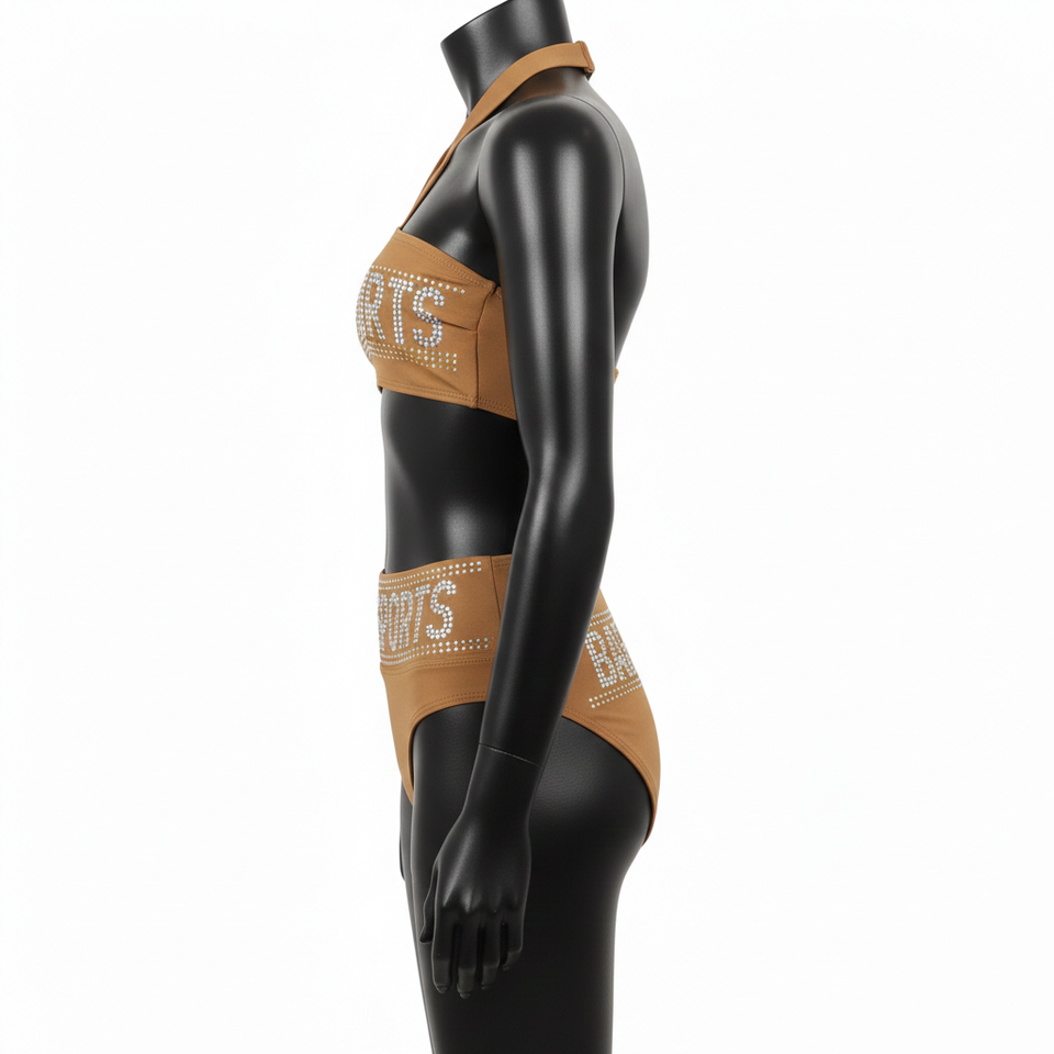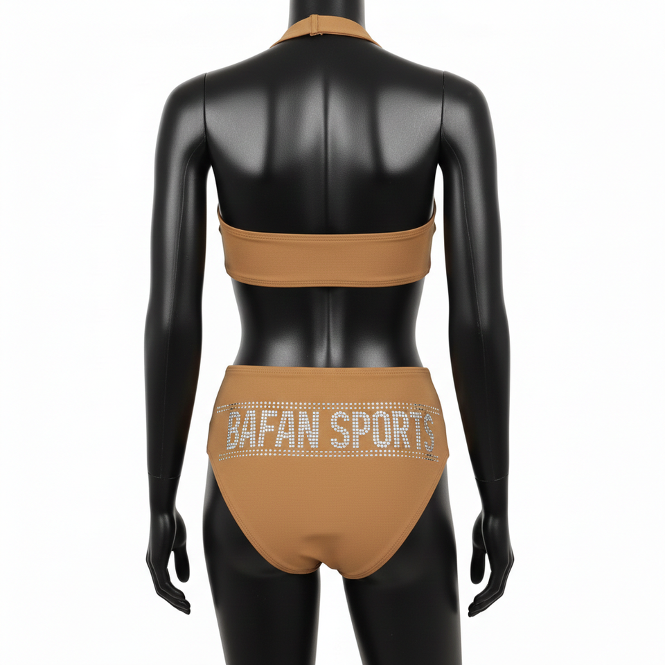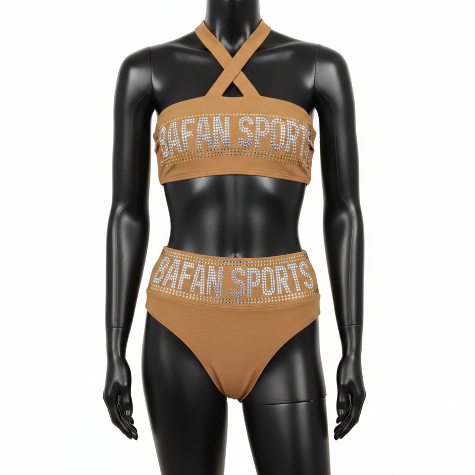 ชุดบิกินี่ไนลอนสแปนเด็กซ์ GSM คุณภาพสูง สีน้ำตาลอ่อน เนื้อผ้ายืดหยุ่นเรียบ ประดับด้วยคริสตัล รับสกรีนโลโก้ตามแบบ ชุดบิกินี่สำหรับผู้หญิง