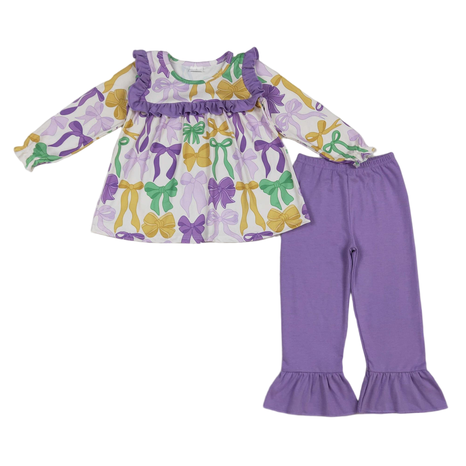 ชุดเสื้อผ้าเด็กผู้หญิงคุณภาพสูงมาร์ดิกราส์สีเหลืองสีเขียวสีม่วงโบว์แขนยาวสีม่วงกางเกงชุดมาใหม่ผ้าไหม