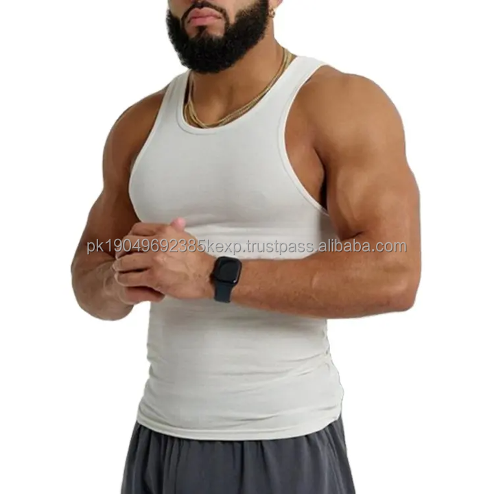 เสื้อกล้ามออกกำลังกายผู้ชาย ผ้าคอตตอนผสมสแปนเด็กซ์ คุณภาพสูง สีขาว กระชับกล้ามเนื้อ แบบร่อง