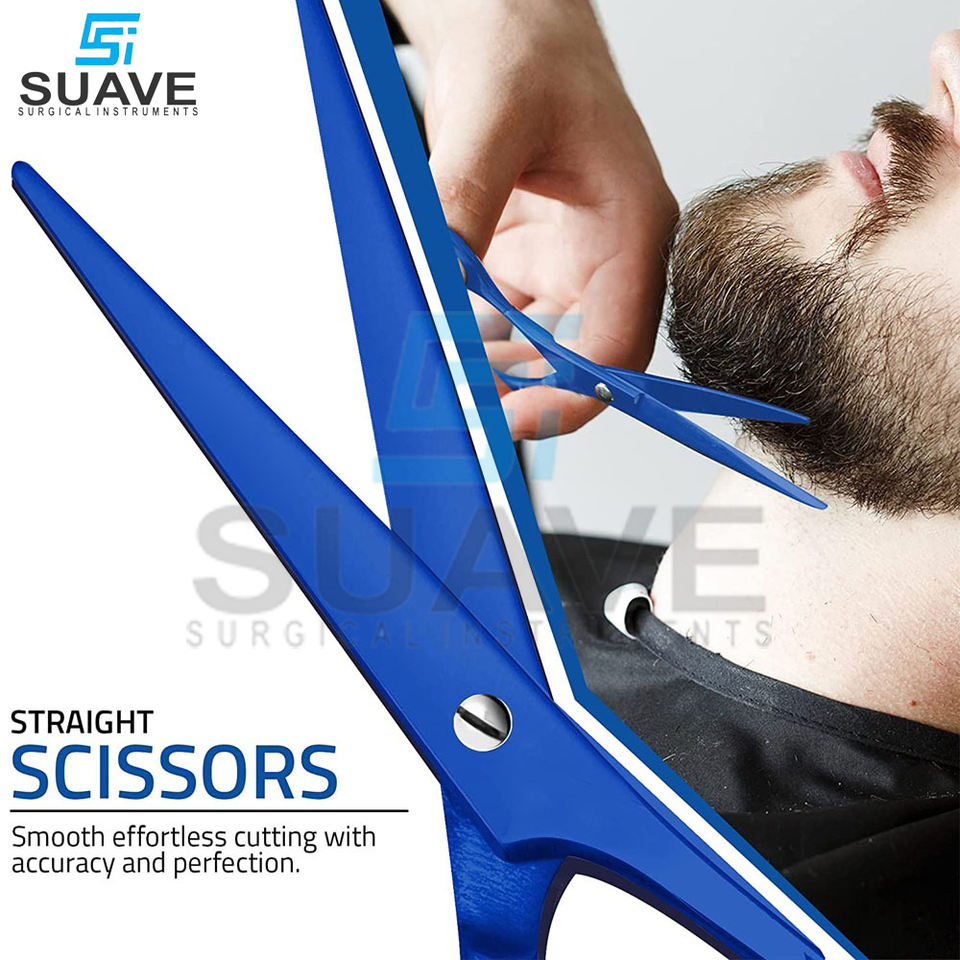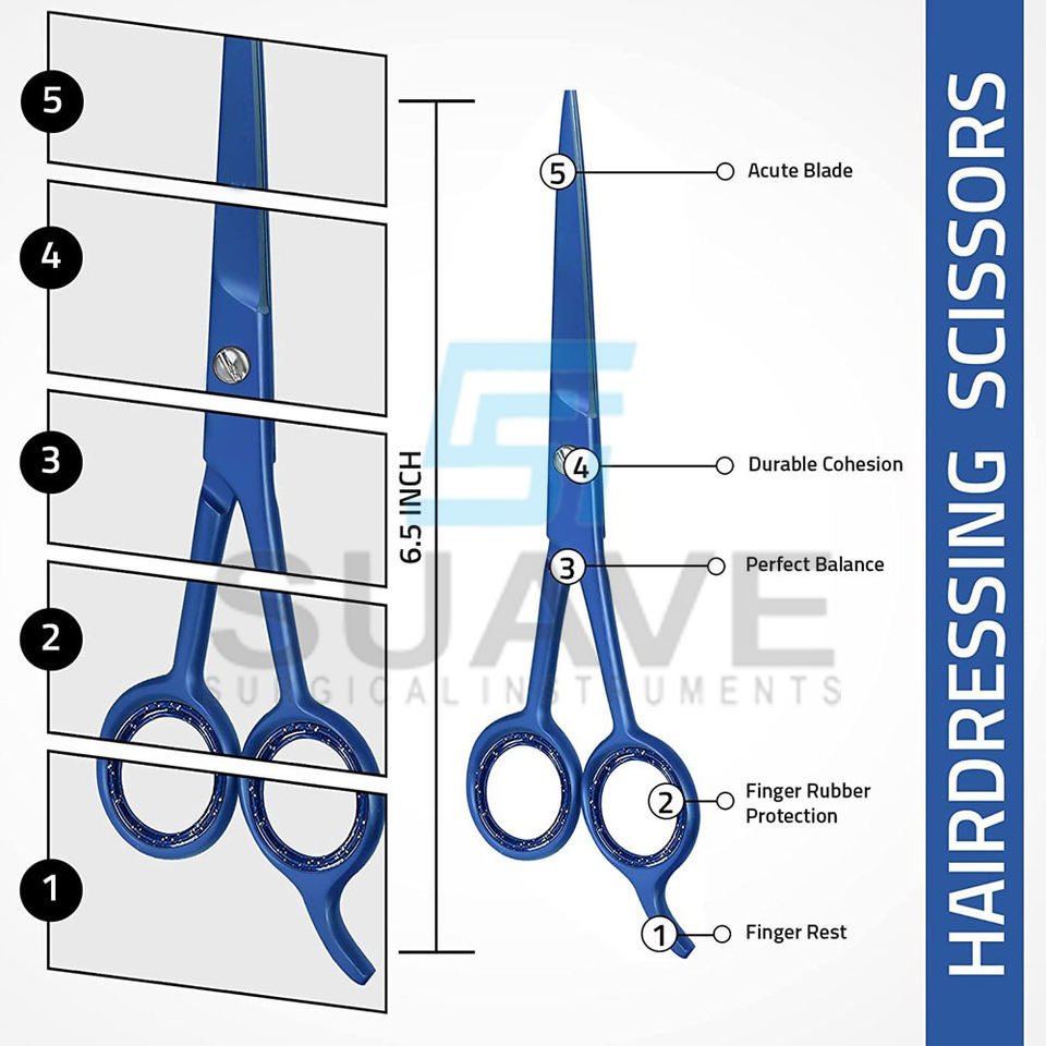 กรรไกรตัดผมสีฟ้าใบมีดสแตนเลสสำหรับใช้ในร้านเสริมสวย