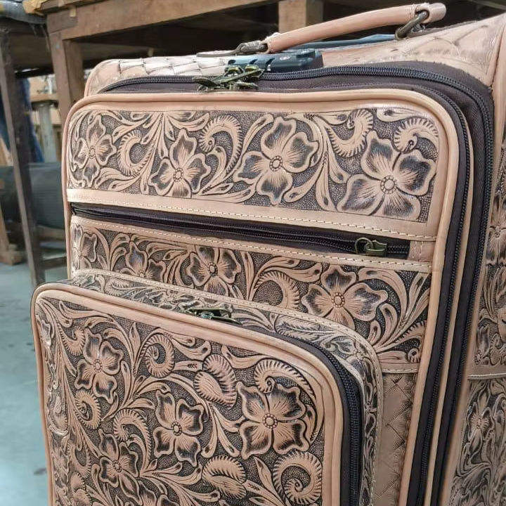 กระเป๋าเดินทางล้อลากหนังแท้ 100% คุณภาพสูง แกะสลักลายดอกไม้ด้วยมือ ดีไซน์คลาสสิกทันสมัย พร้อมหูหิ้ว