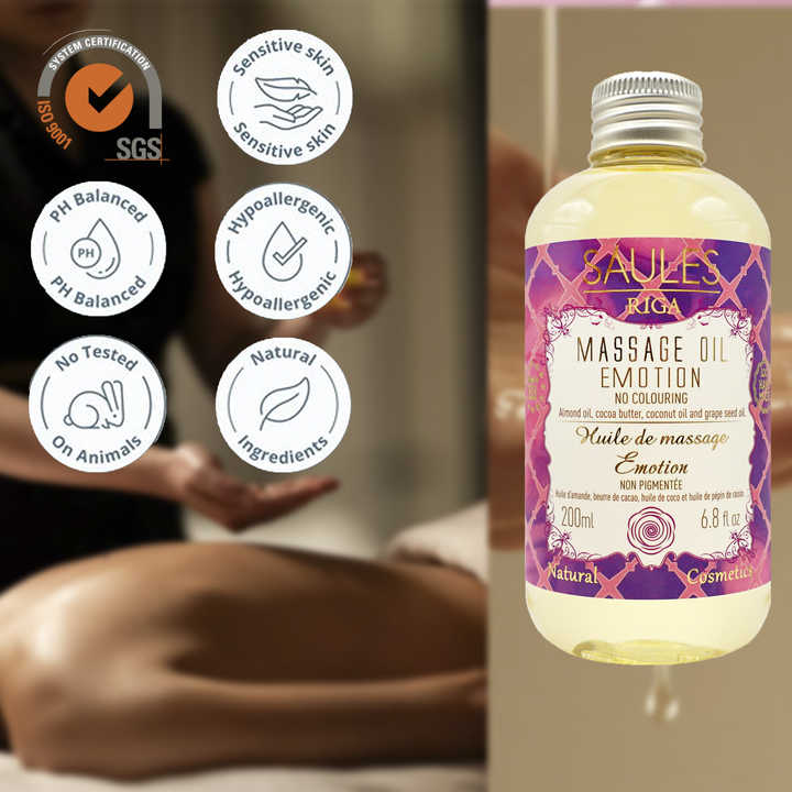 น้ำมันนวดคุณภาพสูง ผลิตด้วยมือ บำรุงผิวชุ่มชื้นและมีคุณค่าทางโภชนาการ ผลิตในสหภาพยุโรป เป็นมิตรต่อสิ่งแวดล้อม สำหรับแบรนด์ส่วนตัว Emotions