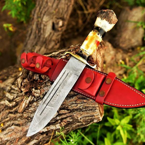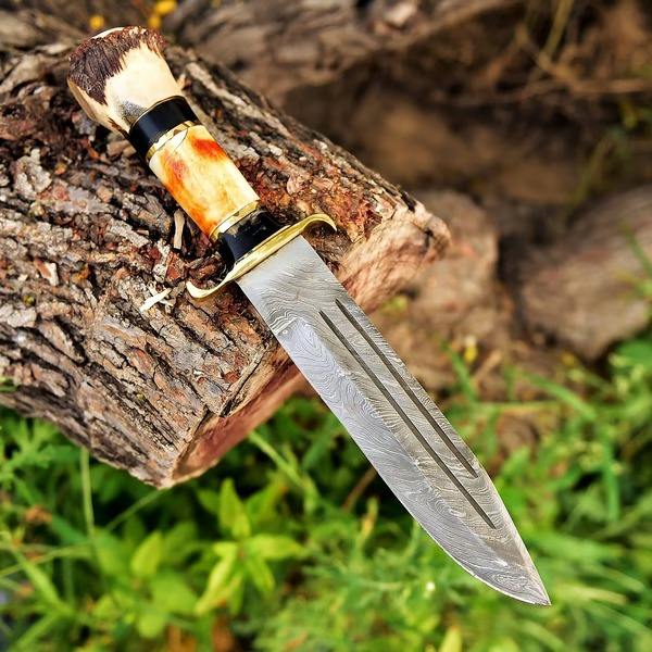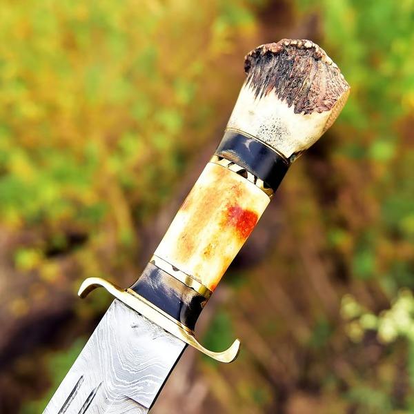 มีดโบวี่เหล็กดามัสกัสแฮนด์เมดคุณภาพสูงด้ามจับฮอร์นแบบคลาสสิกล่าสัตว์กลางแจ้งออกแบบได้ตามต้องการ