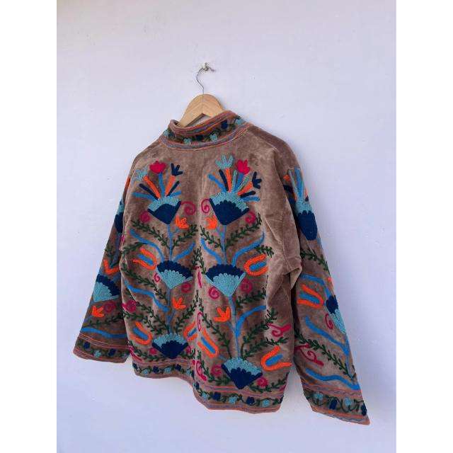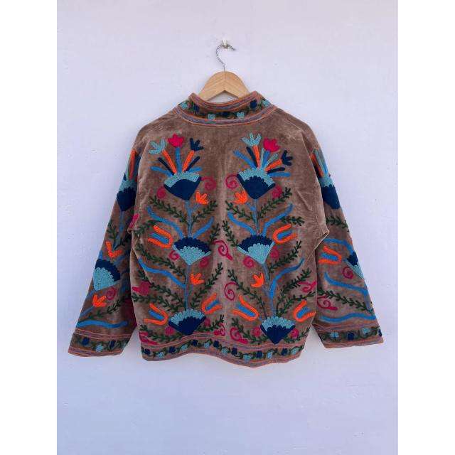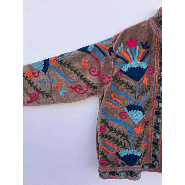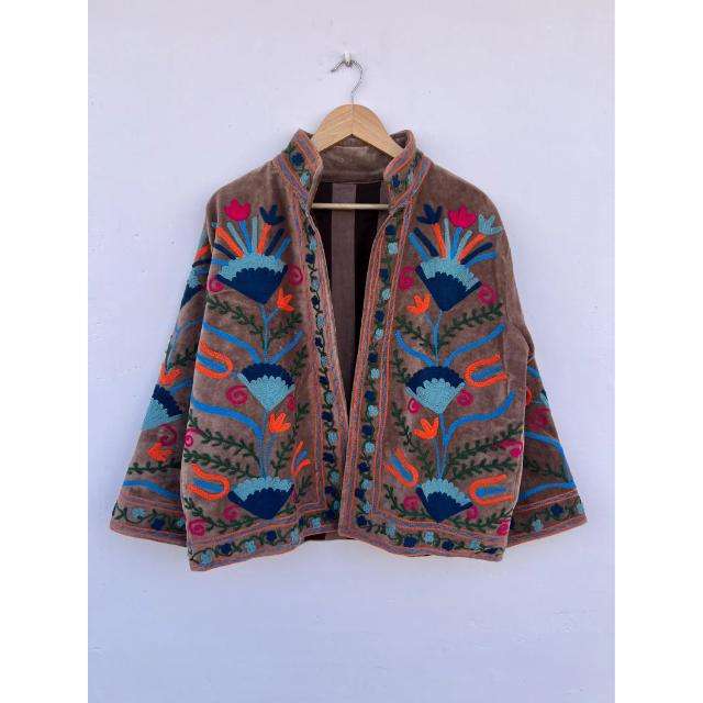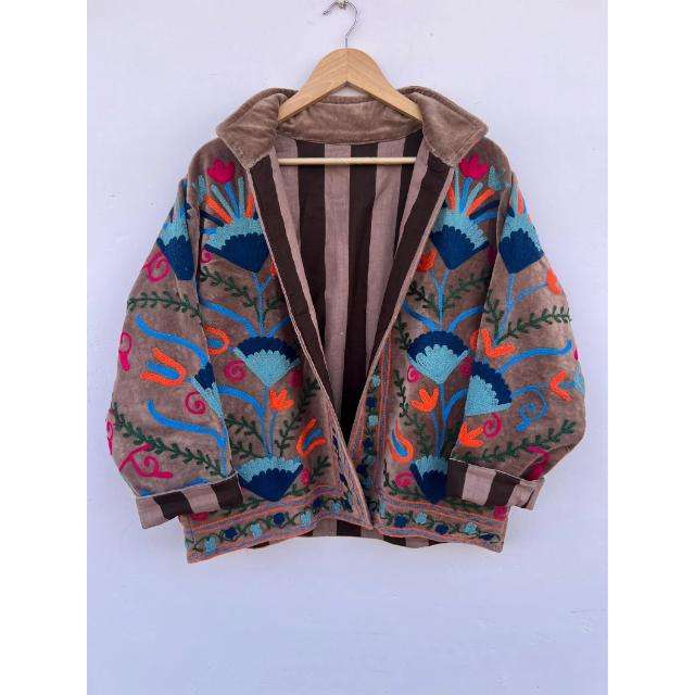 Suzani แจ็กเก็ตถักผ้าฝ้ายงานปักทำด้วยมือเสื้อโค้ทสไตล์โบฮีเมียนเปิดด้านหน้าของขวัญฤดูใบไม้ร่วงสำหรับเสื้อนอกกันฝุ่นของเธอ