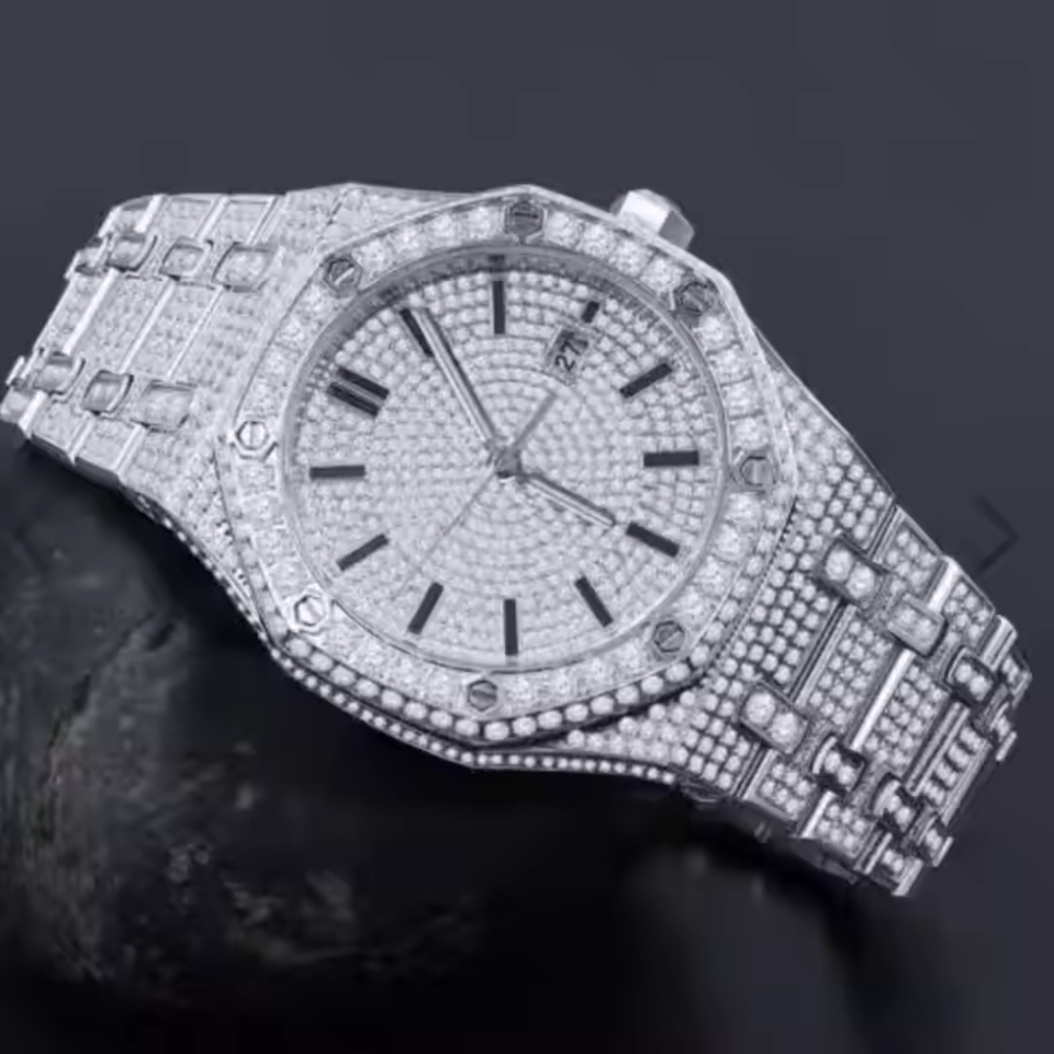 นาฬิกาเพชรสไตล์ฮิปฮอป Vissanite จากอินเดียเคลื่อนไหวอัตโนมัติทำด้วยมือทำจากสแตนเลสเต็มรูปแบบ