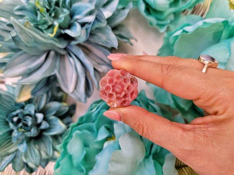 หินอัญมณีดอกบัวโรโดโครไซต์สีเหลืองธรรมชาติทำด้วยมือมีสีสำหรับการรักษาจักระหัวใจและความรัก